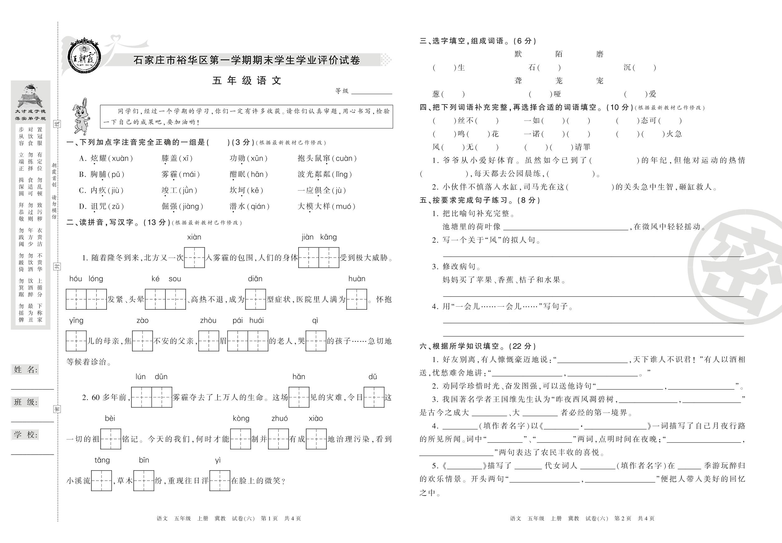 2016-2017学年第一学期石家庄市裕华区五年级语文试卷(冀教版)【6】