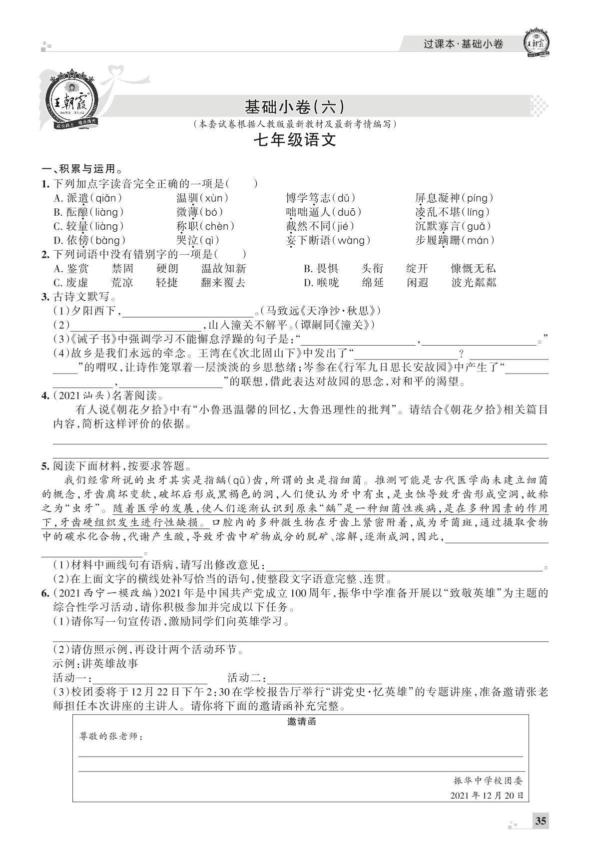 王朝霞期末过课本——基础小卷(六)七年级上册语文(人教版)_R211224101739419【12】