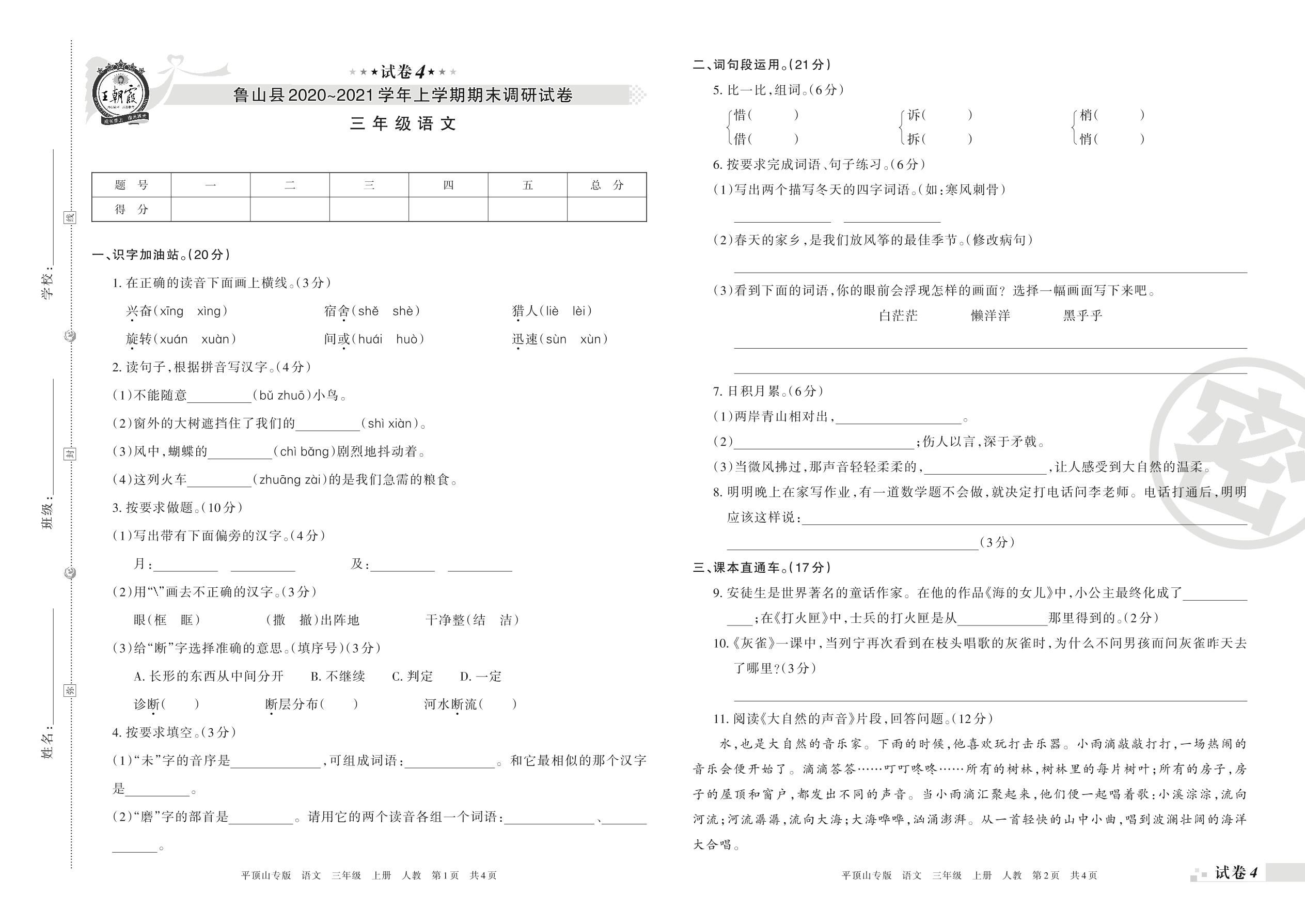 鲁山县2020~2021学年上学期期末调研试卷三年级语文(人教版)【4】