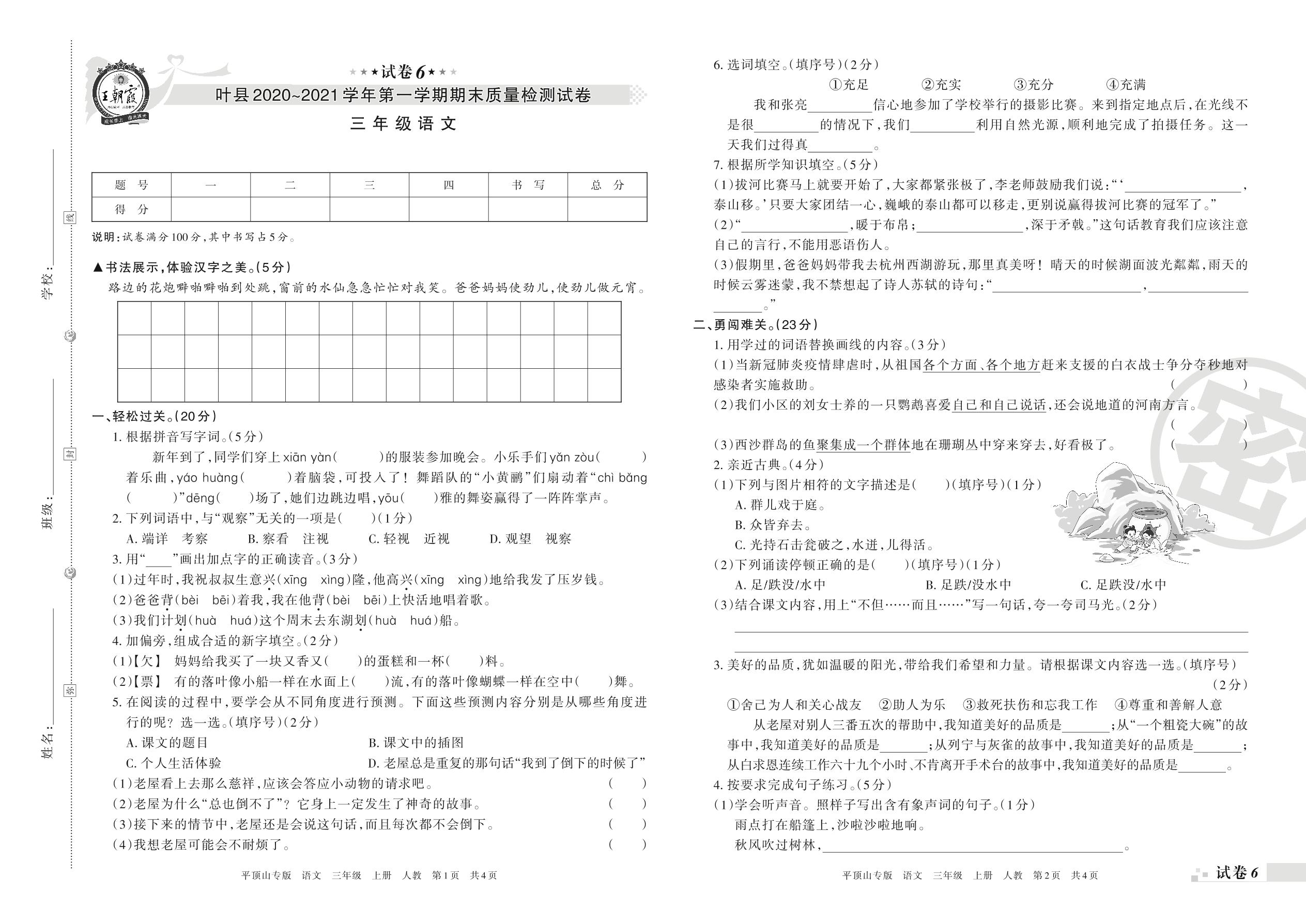 叶县2020~2021学年第一学期期末质量检测试卷三年级语文(人教版)【6】