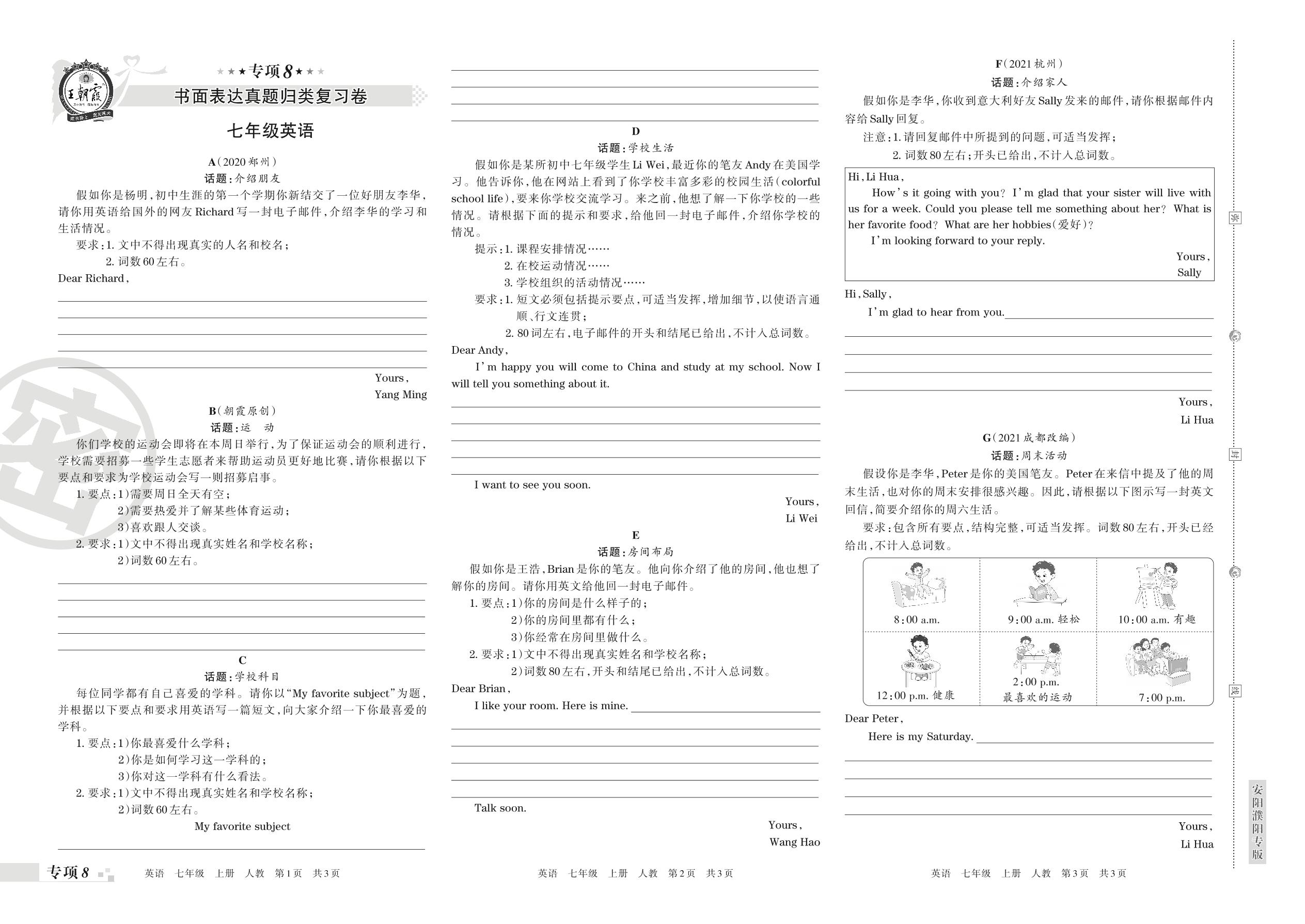 王朝霞期末专项卷——书面表达真题归类复习卷七年级上册英语(人教版)_R211224102244728【8】
