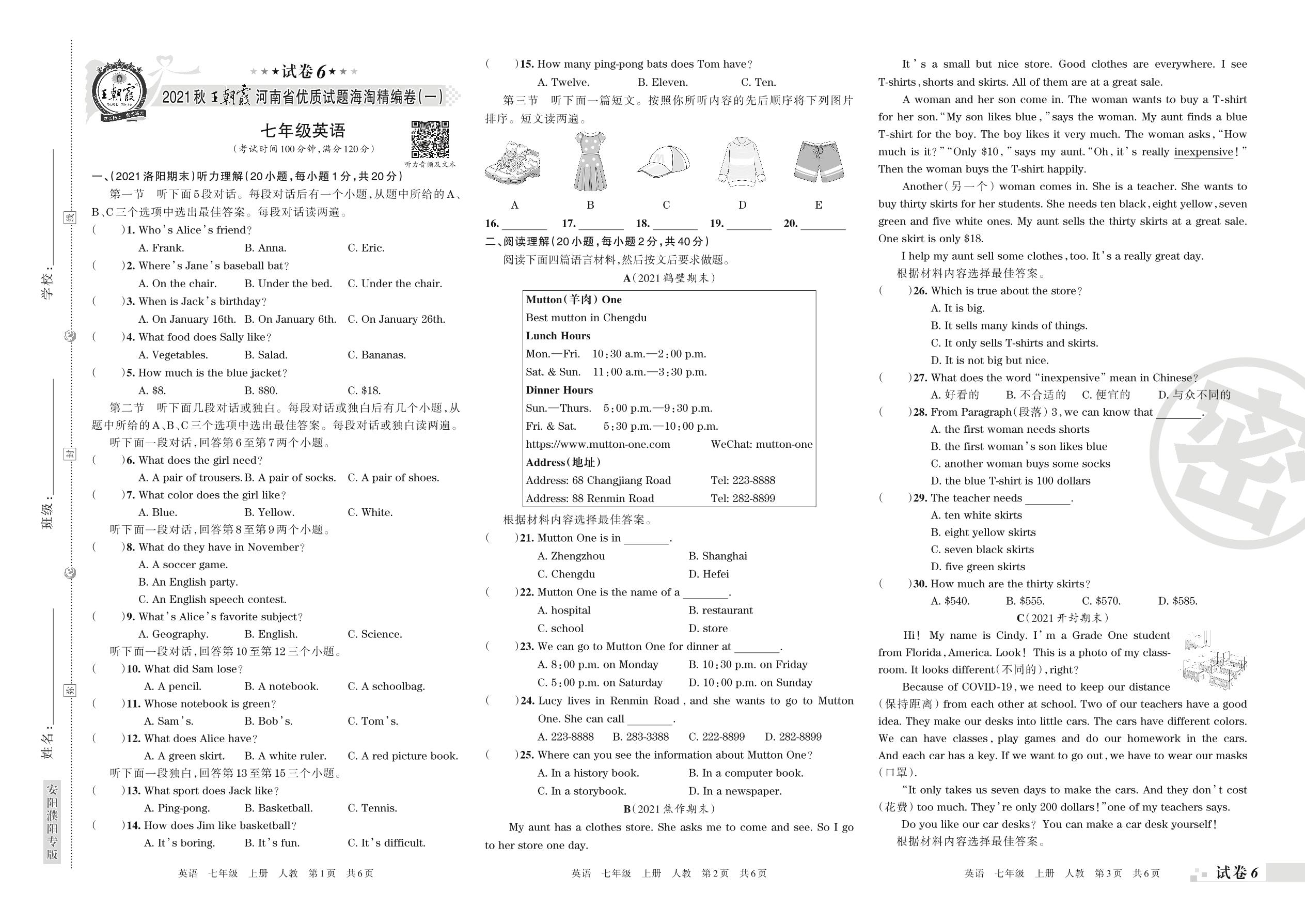 河南省优质试题海淘精编卷(一)七年级上册英语(人教版)【6】