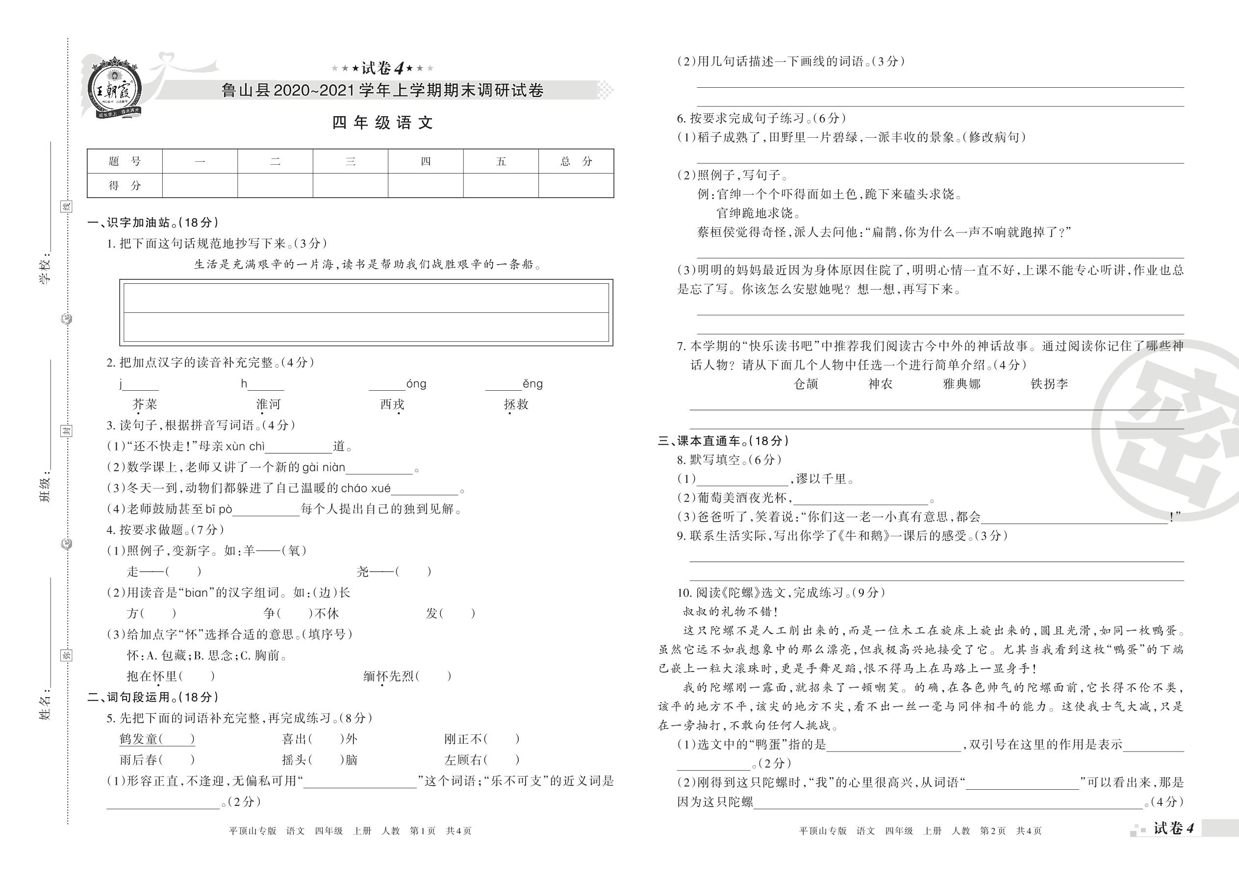 鲁山县2020~2021学年上学期期末调研试卷四年级语文(人教版)【4】