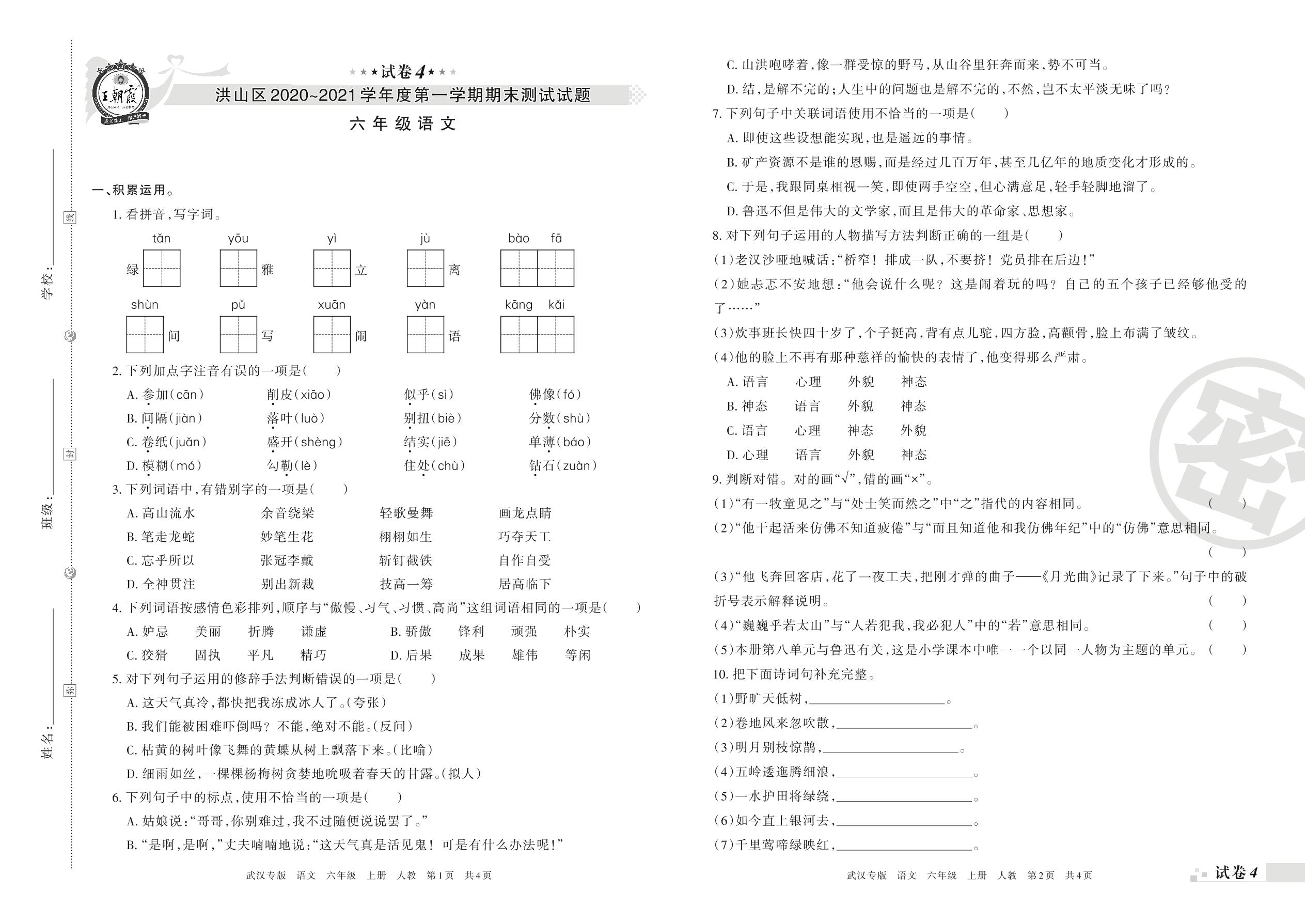 洪山区2020~2021学年度第一学期期末测试试题六年级语文(人教版)【4】