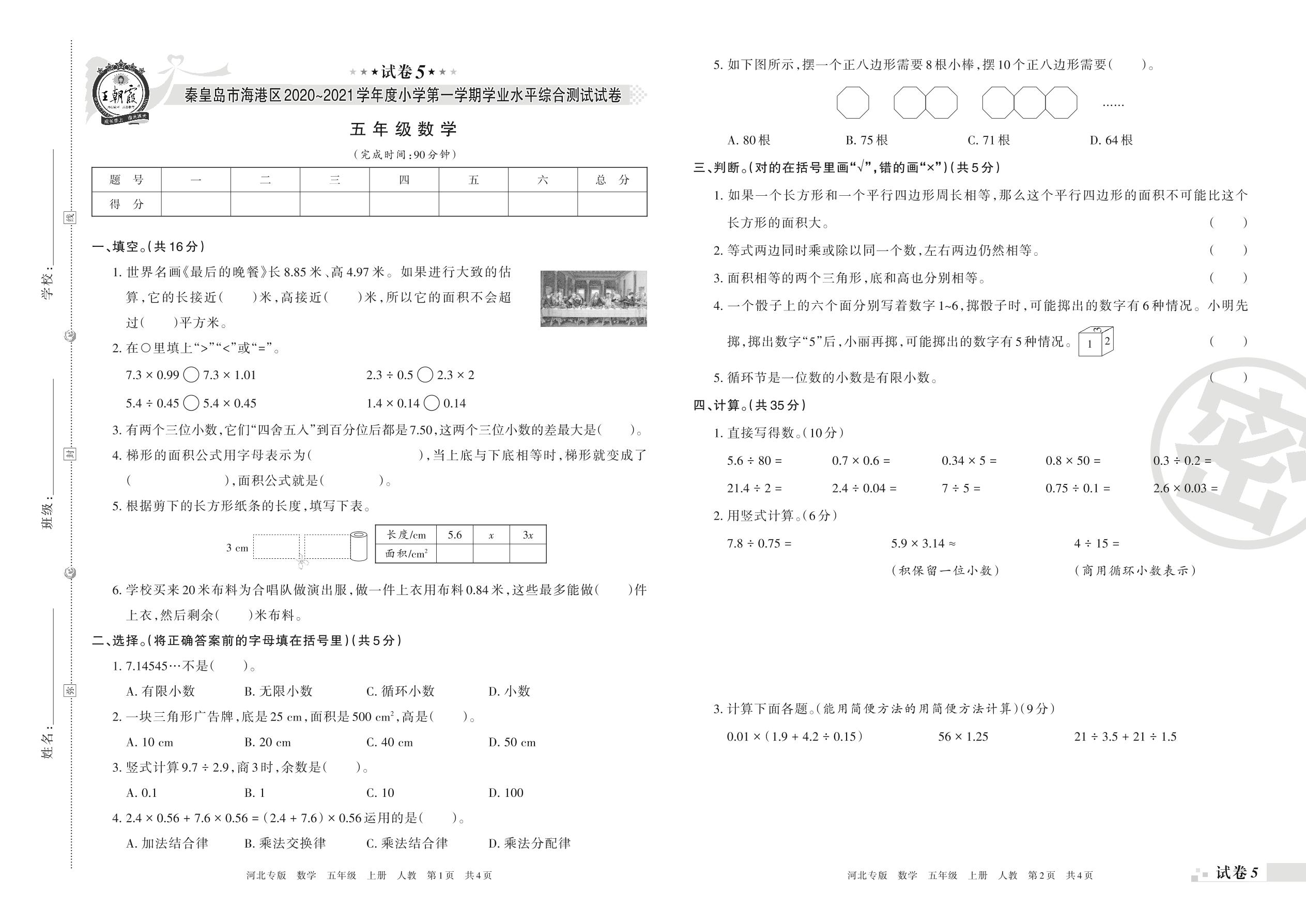 秦皇岛市海港区2020~2021学年度小学第一学期学业水平综合测试试卷五年级数学(人教版)【5】