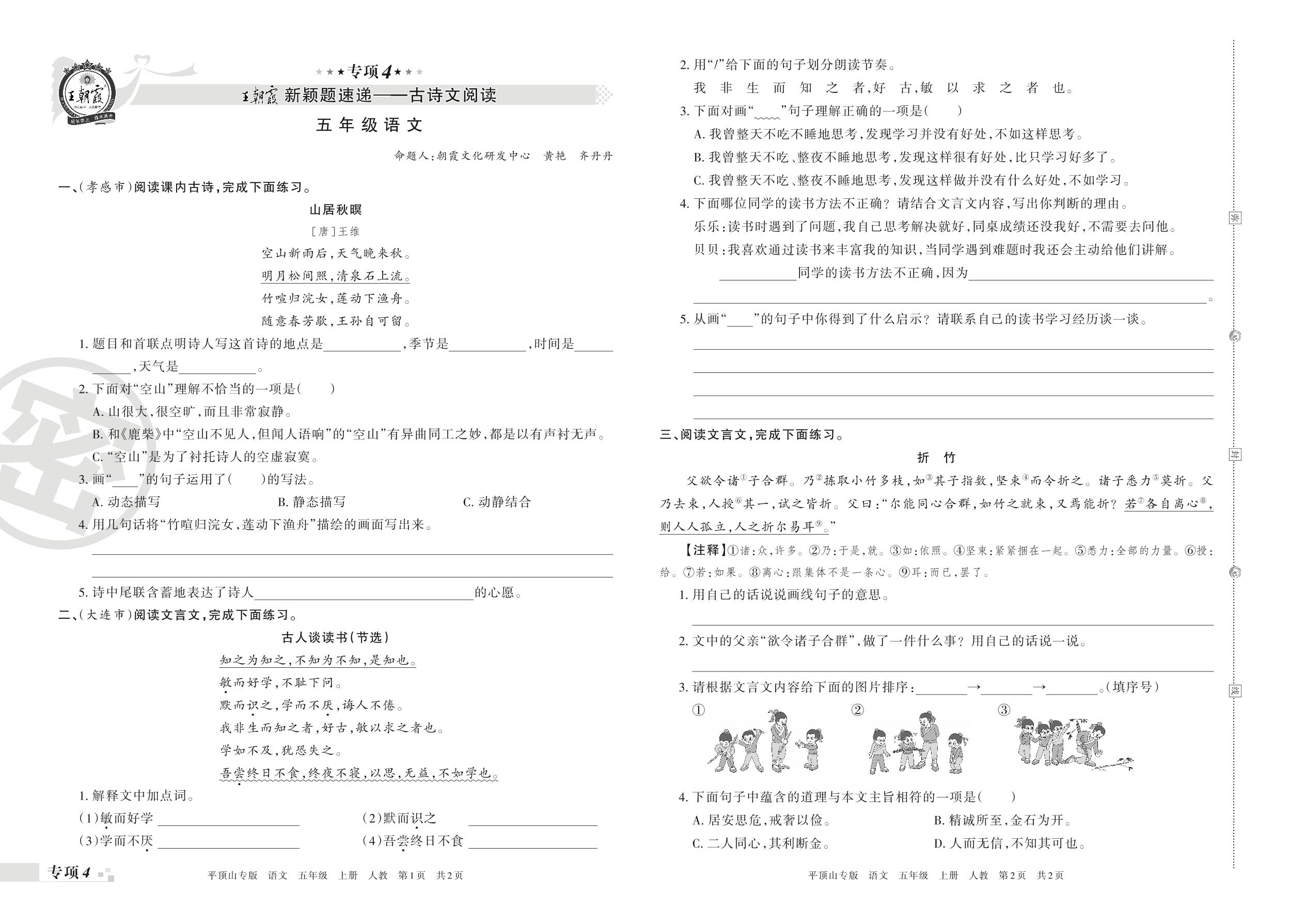 王朝霞期末专项卷——新颖题速递:古诗文阅读五年级上册语文(人教版)_R211224102945904【4】