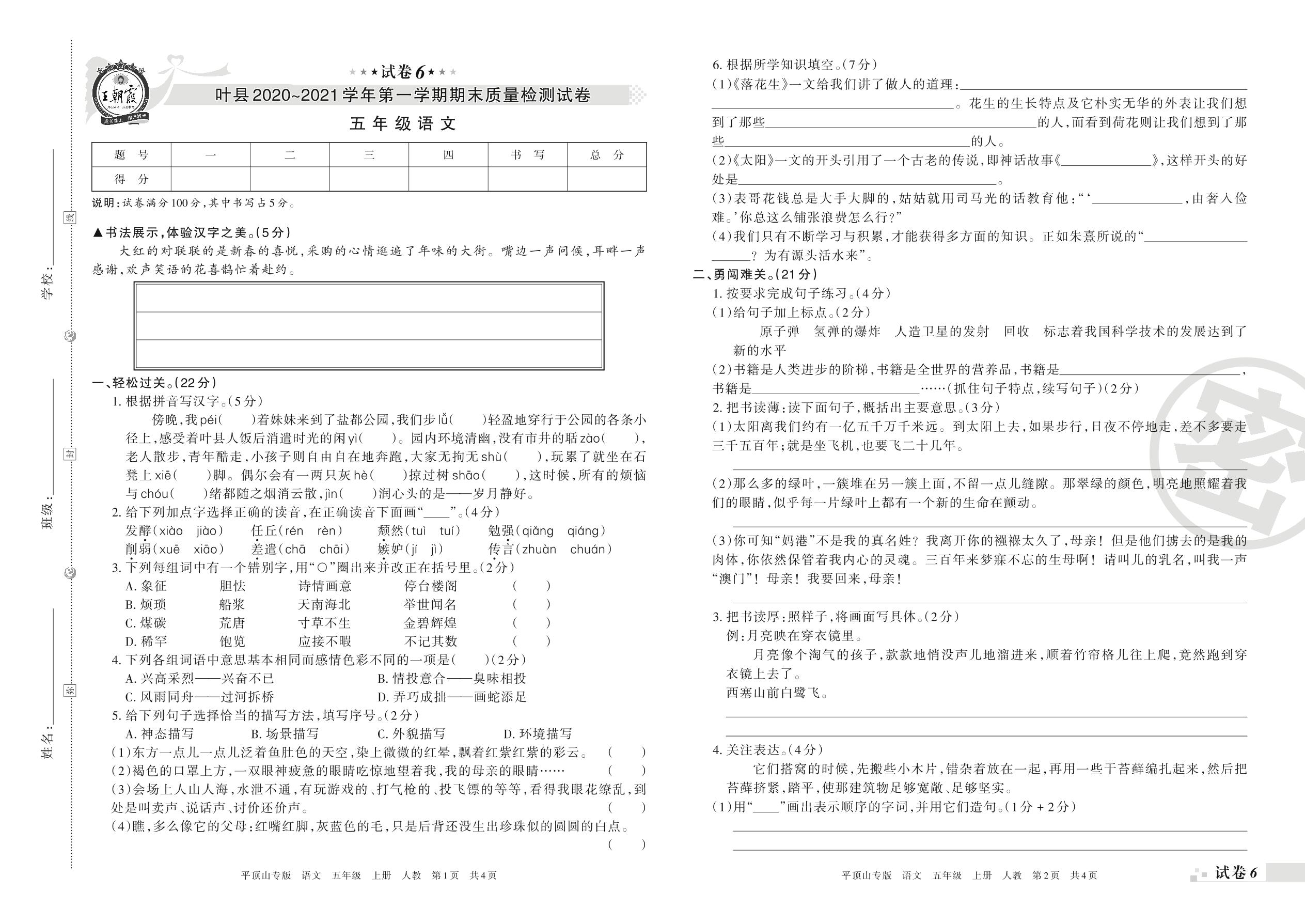 叶县2020~2021 学年第一学期期末质量检测试卷五年级语文(人教版)【6】