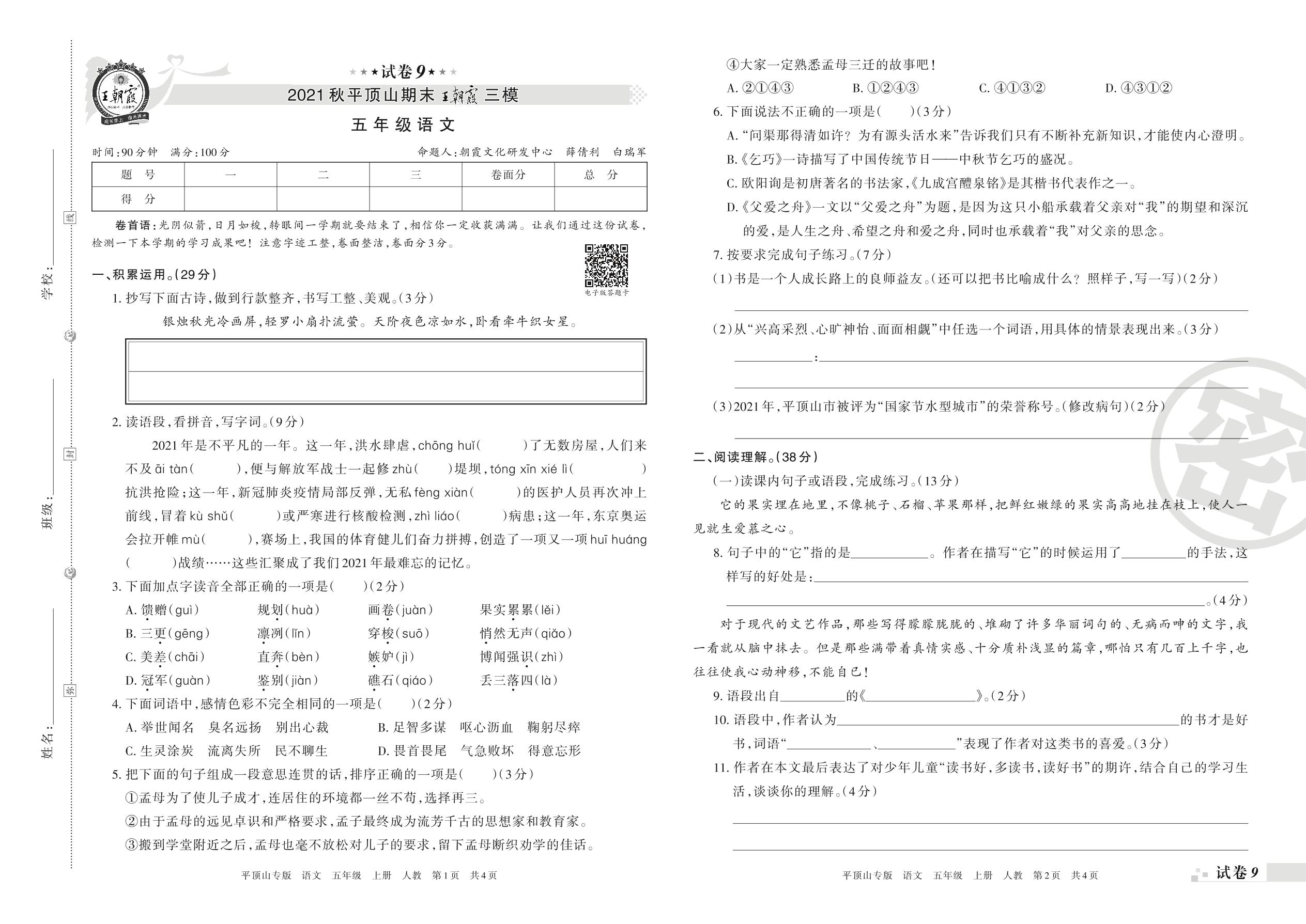 王朝霞期末模拟卷五年级上册语文(人教版)_R211224102946982【9】