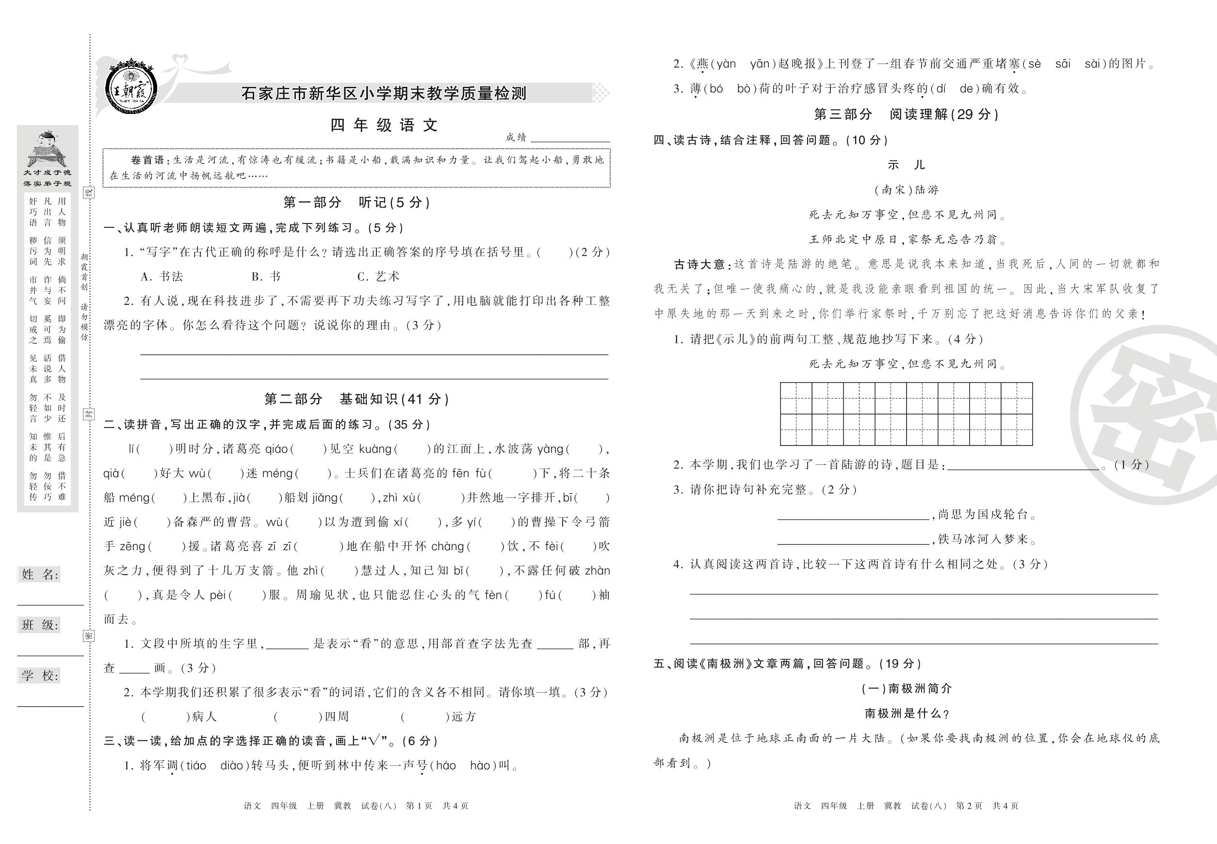 2016-2017学年第一学期石家庄市新华区四年级语文试卷(冀教版)【8】