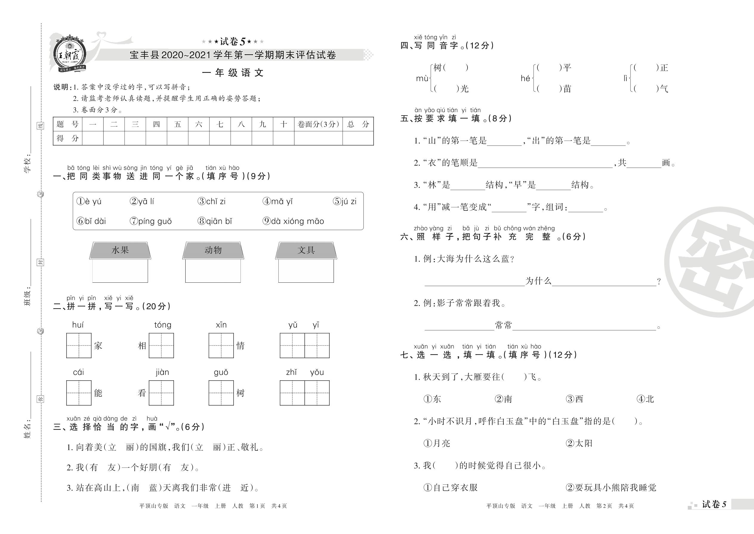 宝丰县2020~2021学年第一学期期末评估试卷一年级语文(人教版)【5】