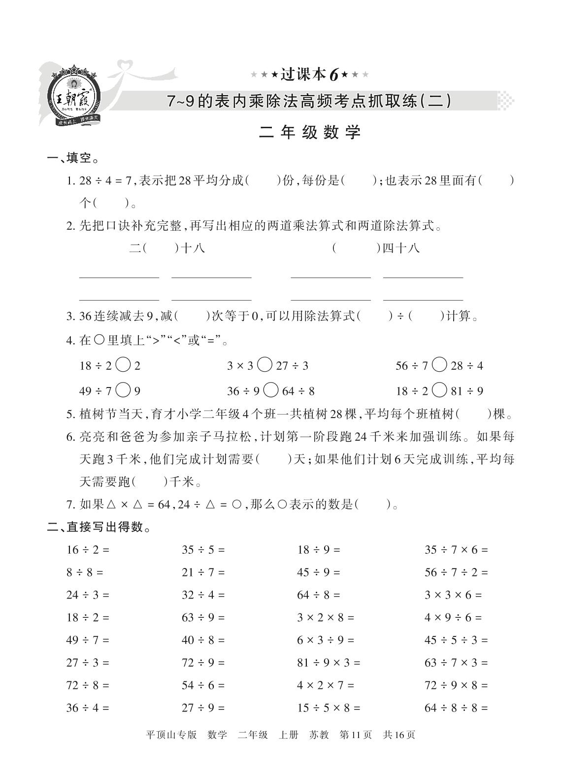 王朝霞期末过课本——7~9的表内乘除法高频考点抓取练(二)二年级上册数学(苏教版)_R211224103718071【6】