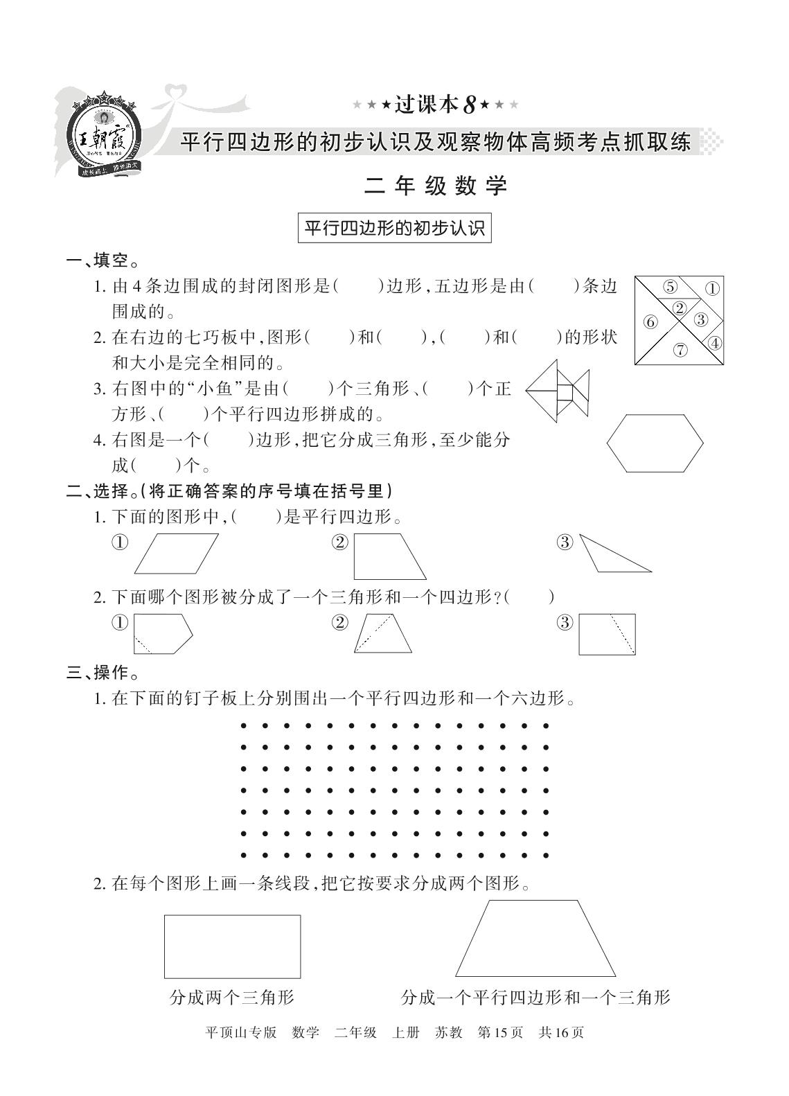 王朝霞期末过课本——平行四边形的初步认识及观察物体高频考点抓取练二年级上册数学(苏教版)_R211224103719789【8】