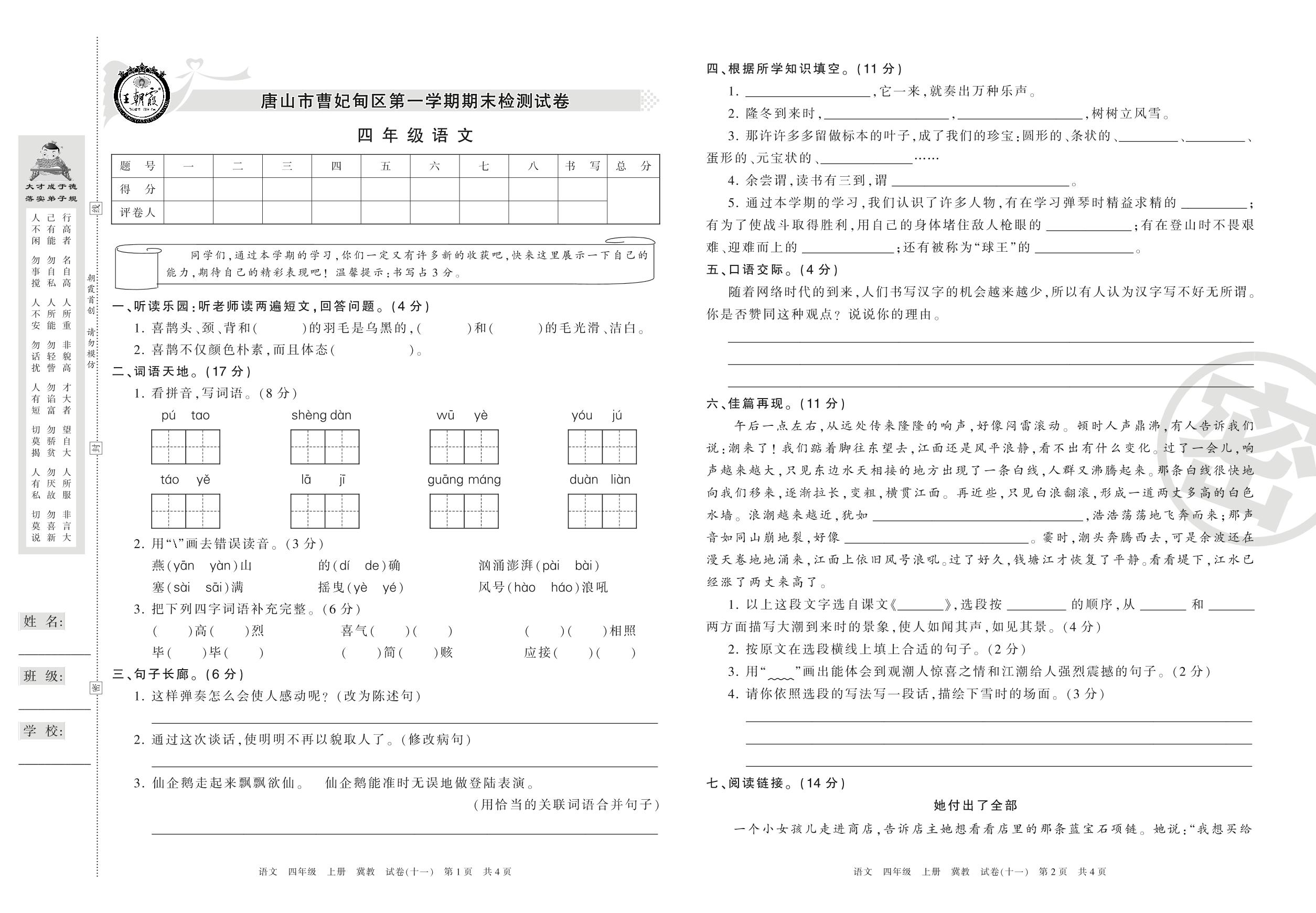 2016-2017学年第一学期唐山市曹妃甸区四年级语文试卷(冀教版)【11】