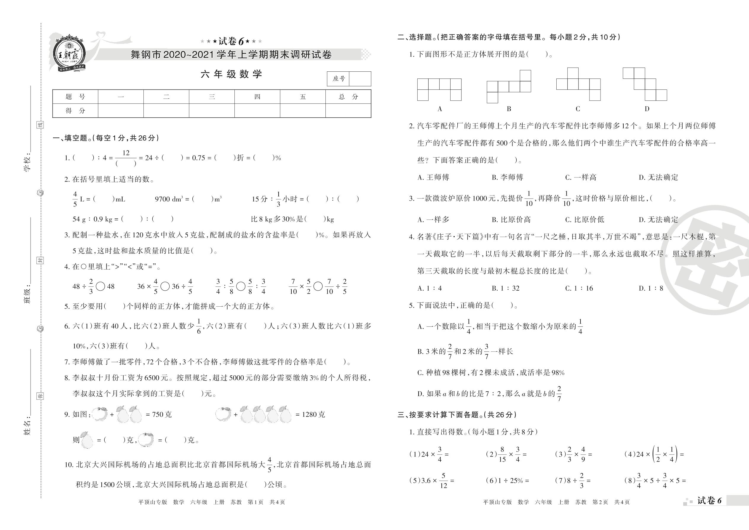舞钢市2020~2021学年上学期期末调研试卷六年级数学(苏教版)【6】