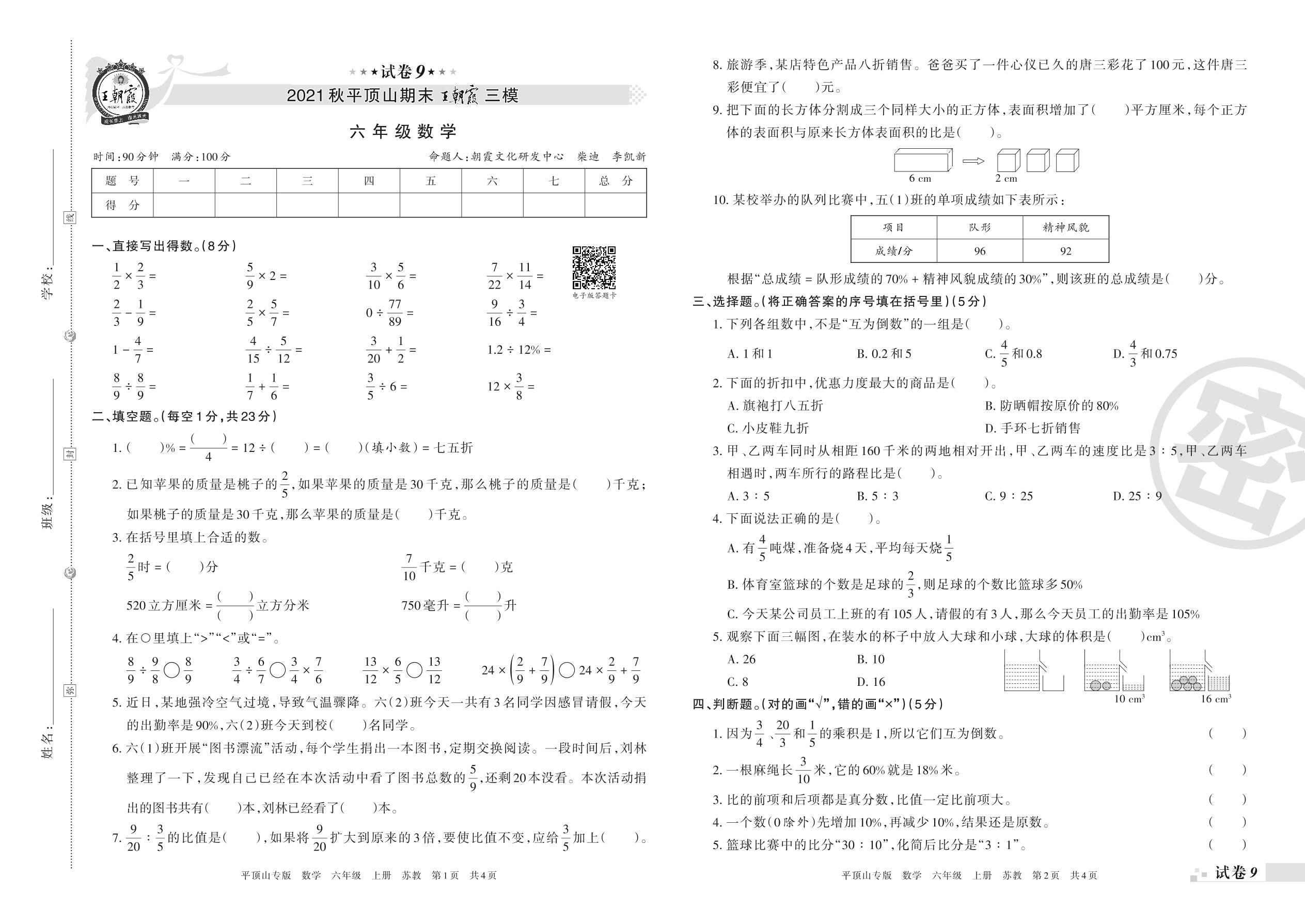 王朝霞期末模拟卷六年级上册数学(苏教版)_R211224104133804【9】