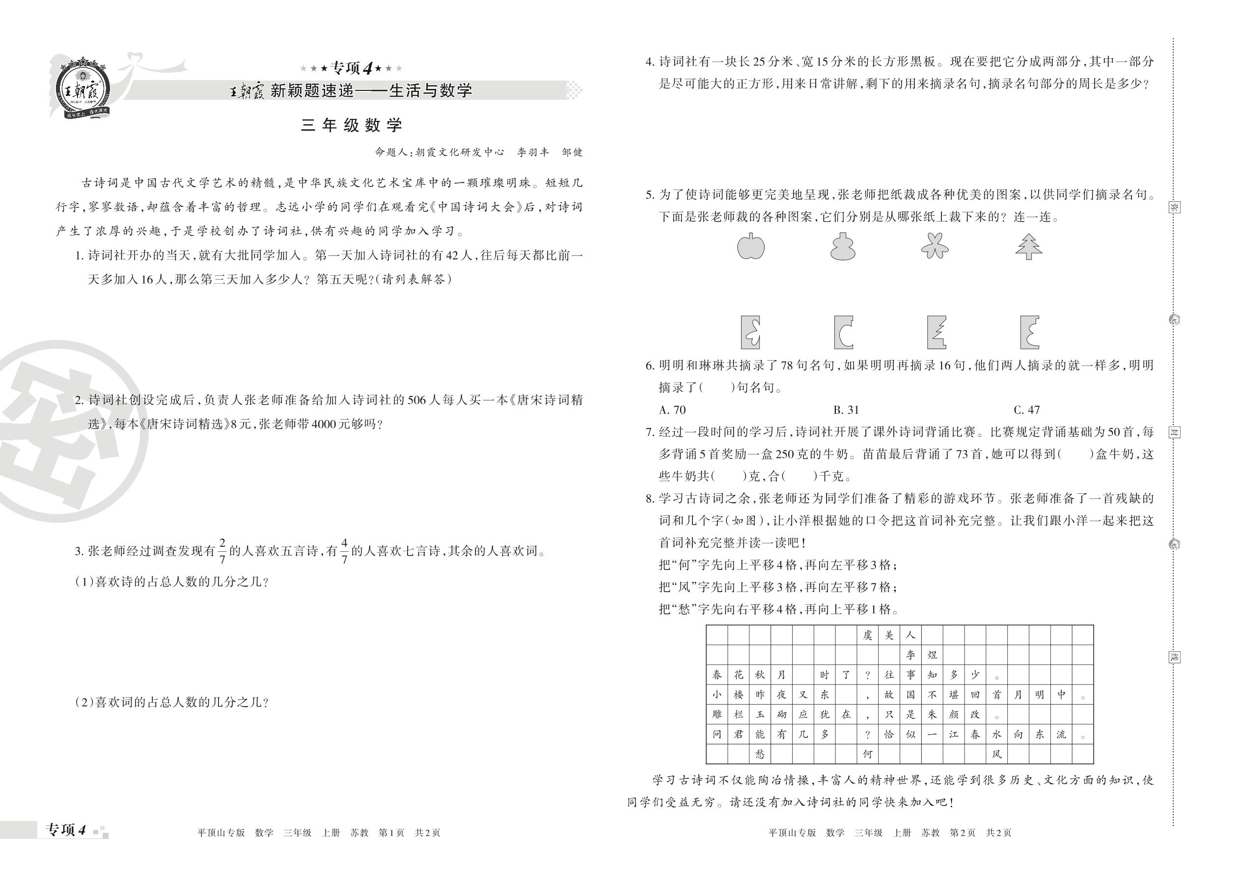 王朝霞期末专项卷——新颖题速递:生活与数学三年级上册数学(苏教版)_R211224104507035【4】