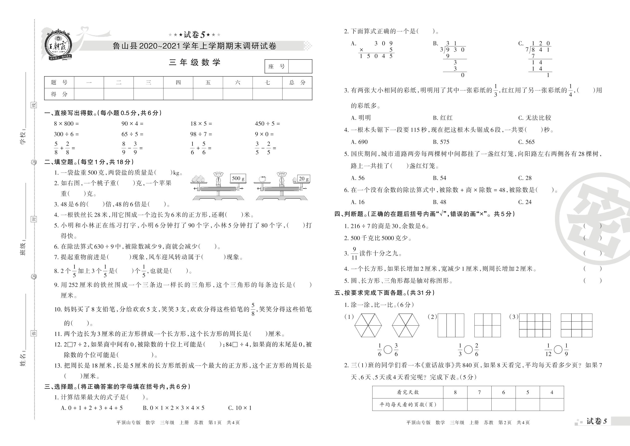 鲁山县2020~2021学年上学期期末调研试卷三年级数学(苏教版)【5】