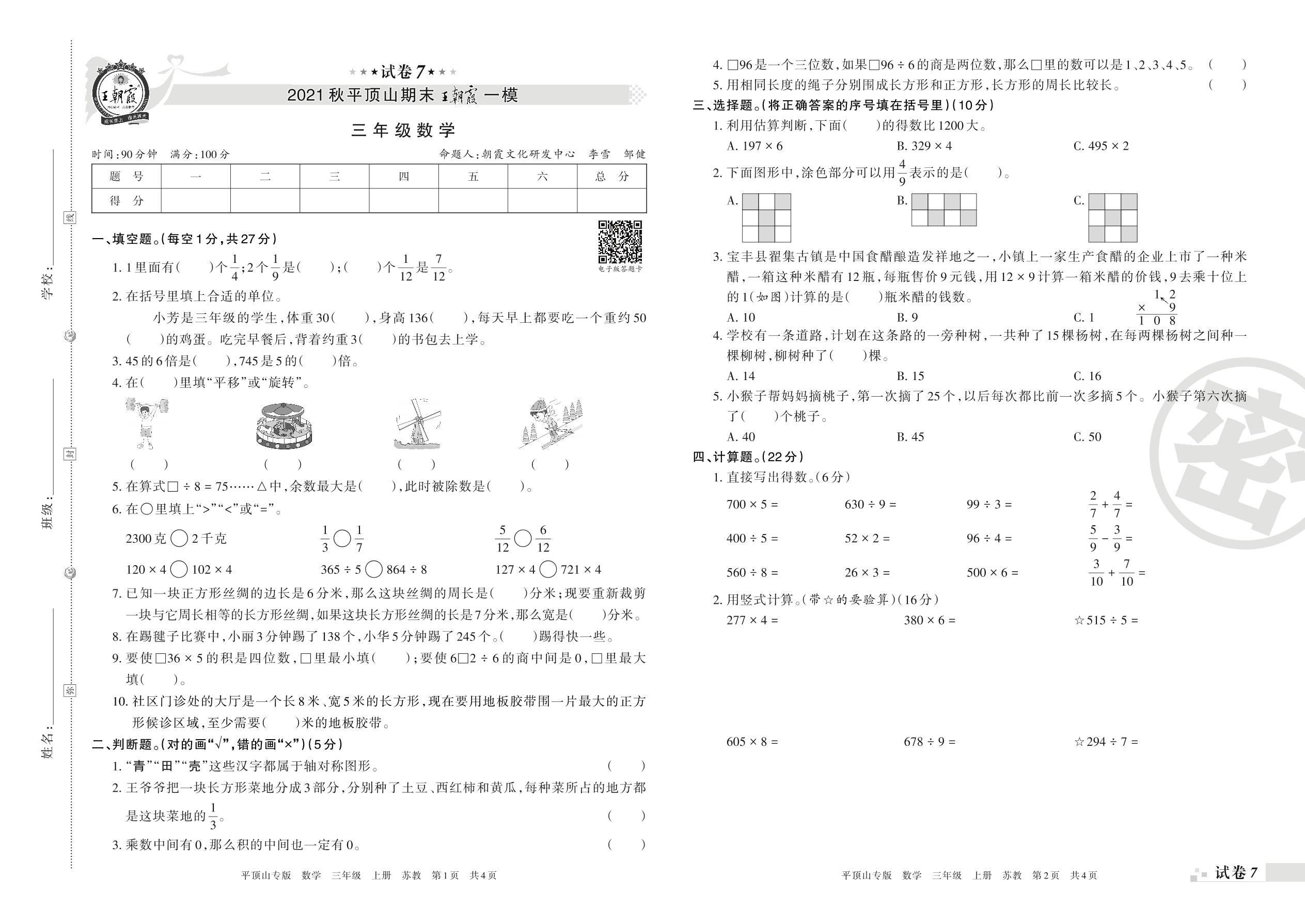 王朝霞期末模拟卷三年级上册数学(苏教版)_R211224104507633【7】