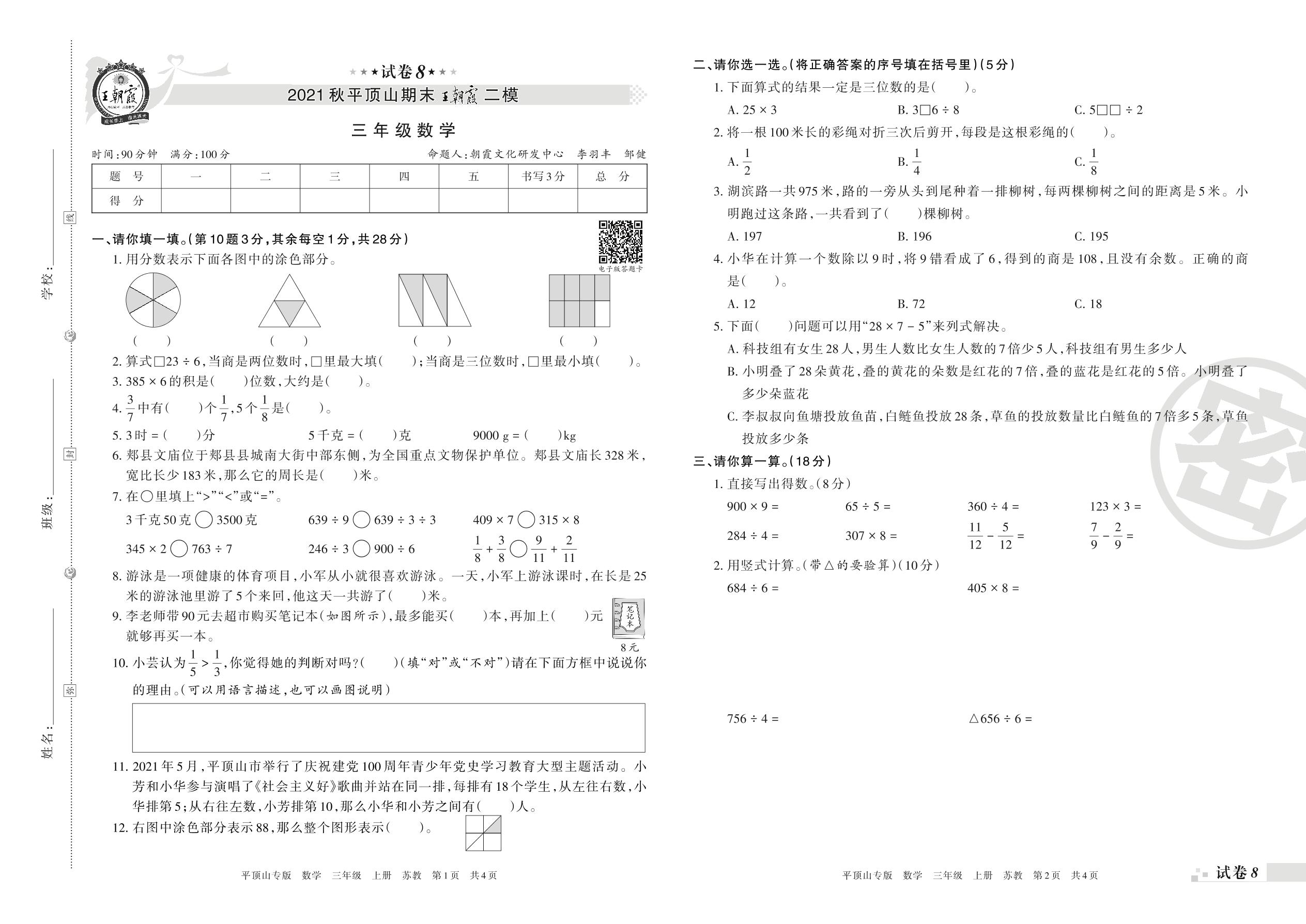 王朝霞期末模拟卷三年级上册数学(苏教版)_R211224104507869【8】