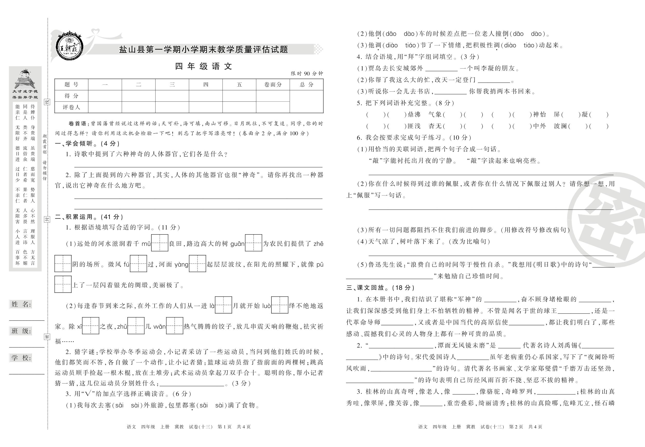 2016-2017学年第一学期沧州市盐山县四年级语文试卷(冀教版)【13】