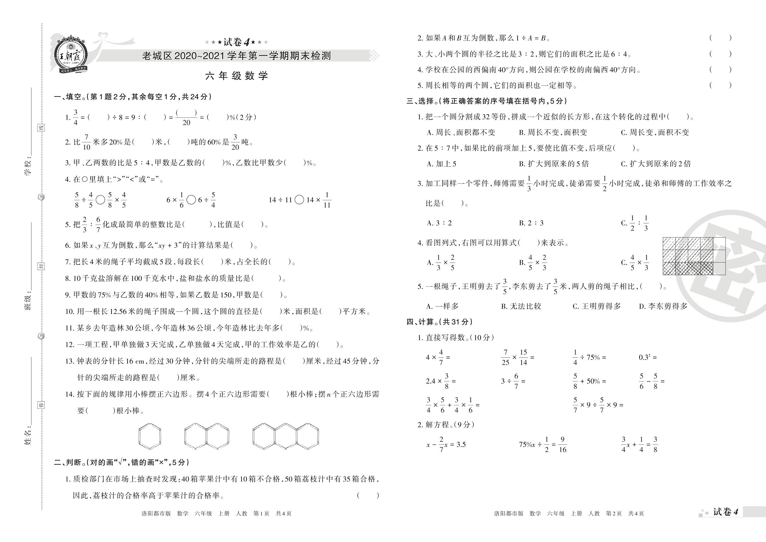老城区2020~2021学年第一学期期末检测六年级数学(人教版)【4】