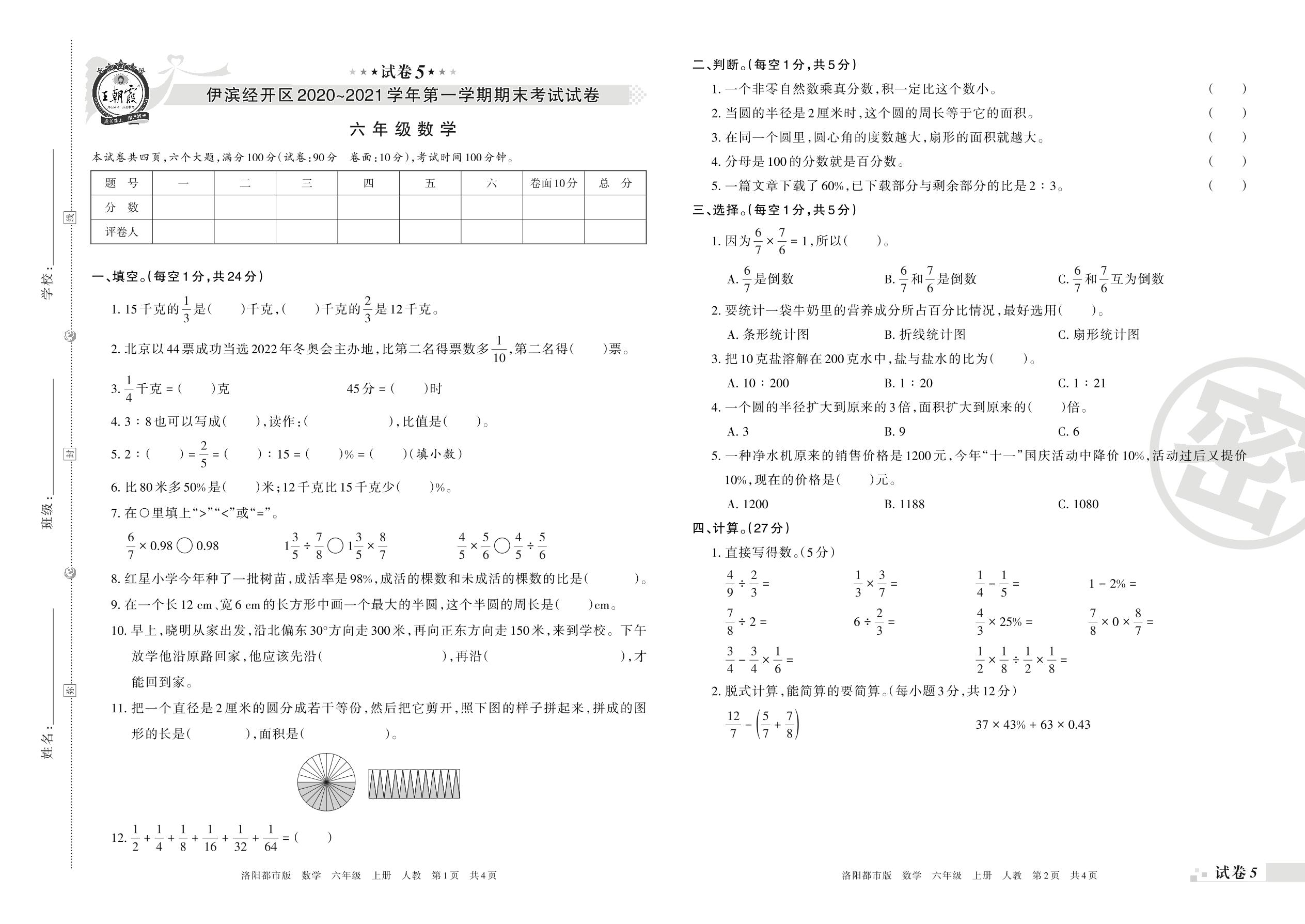 伊滨经开区2020~2021学年第一学期期末考试试卷六年级数学(人教版)【5】