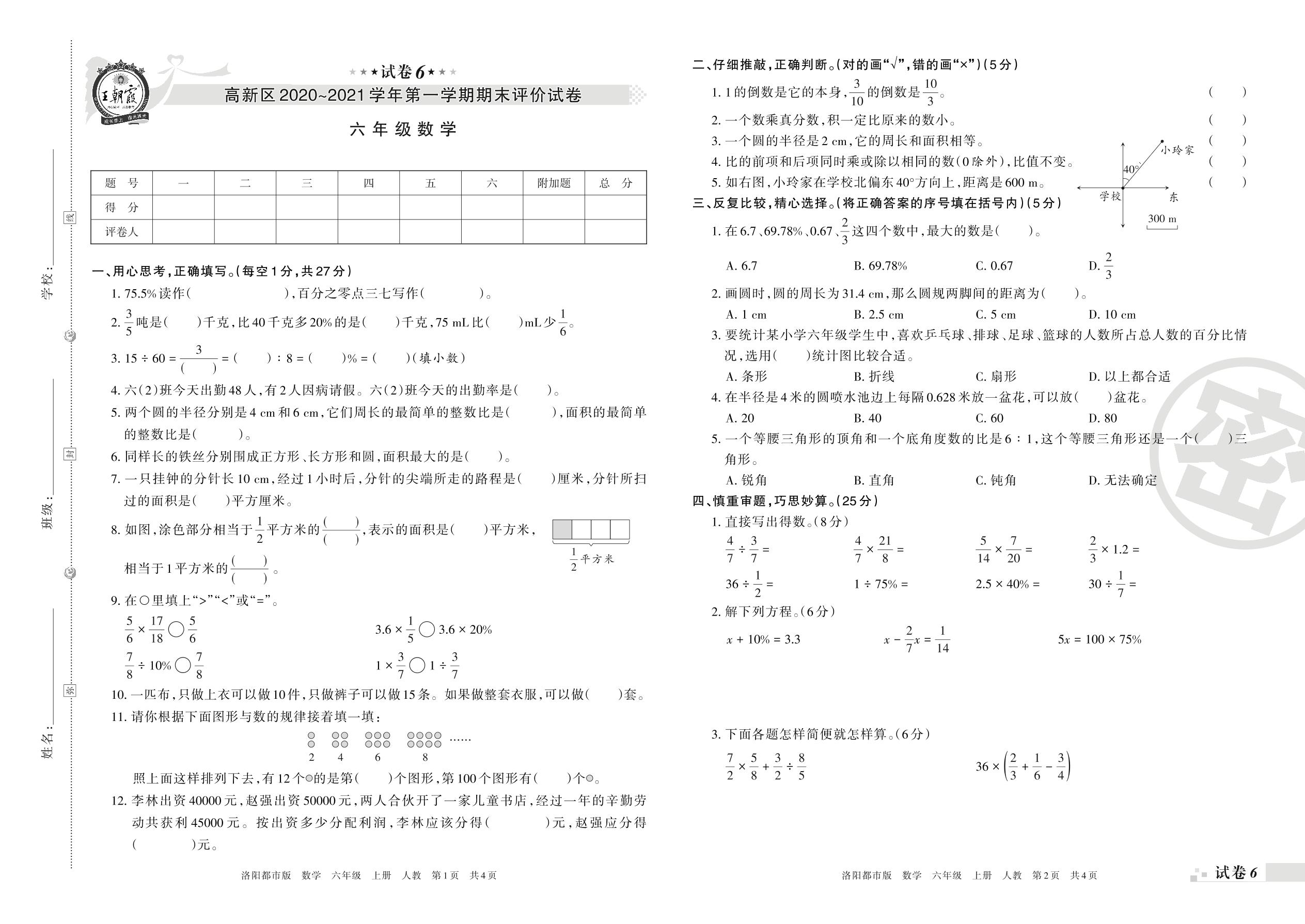 高新区2020~2021学年第一学期期末评价试卷六年级数学(人教版)【6】