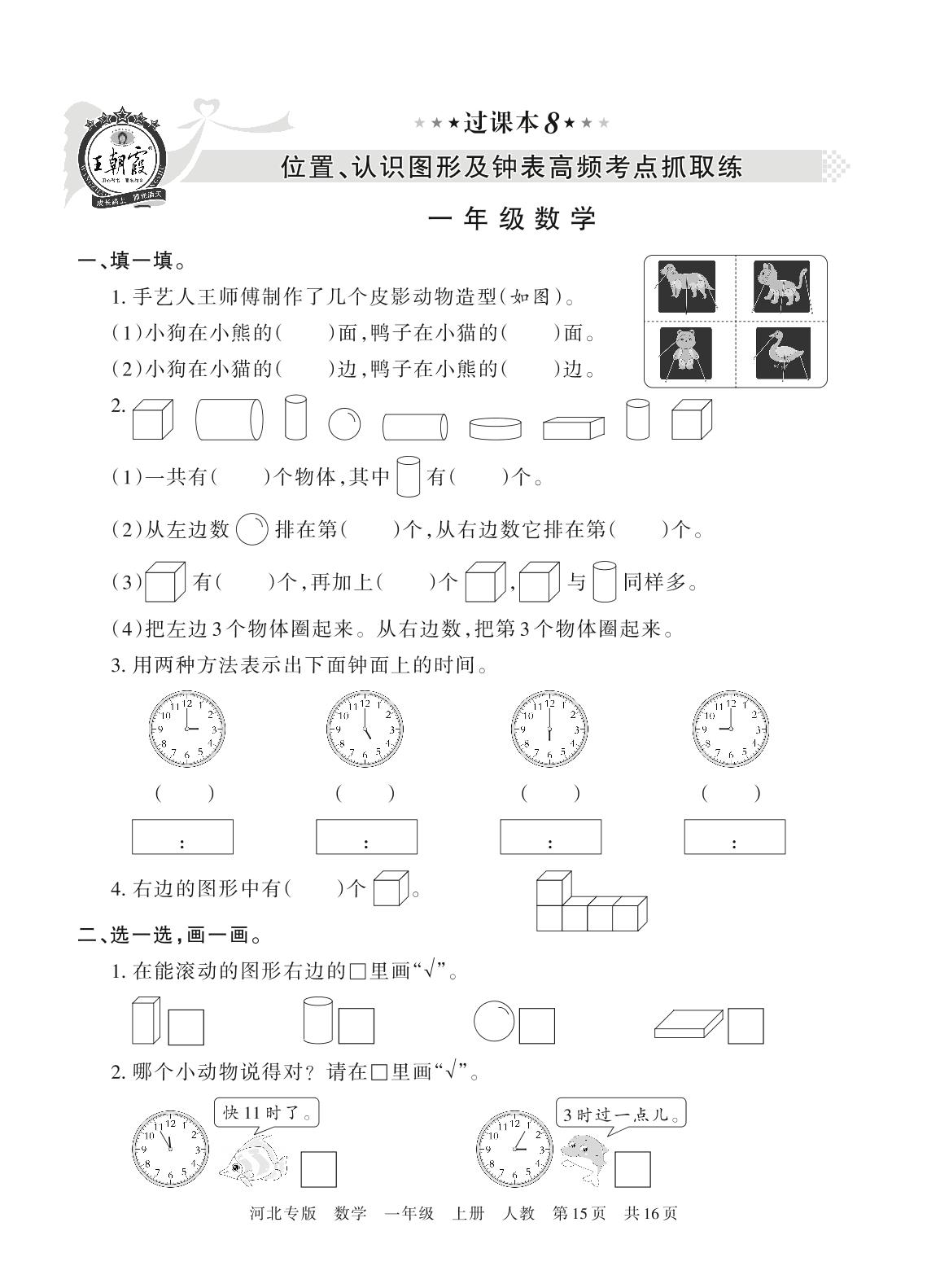 王朝霞期末过课本——位置、认识图形及钟表高频考点抓取练一年级上册数学(人教版)_R211224104559907【8】