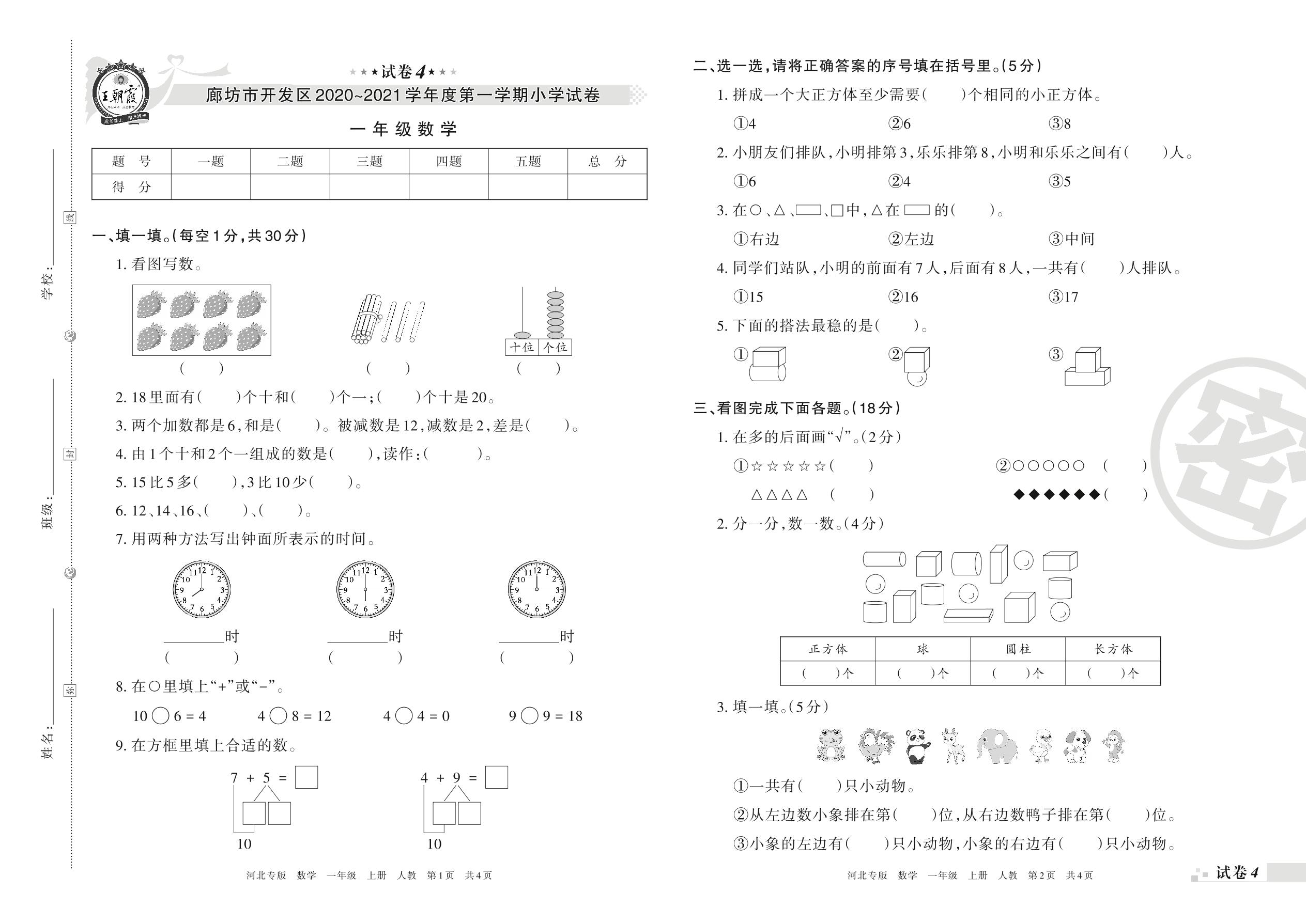 廊坊市开发区2020~2021学年度第一学期小学试卷一年级数学(人教版)【4】