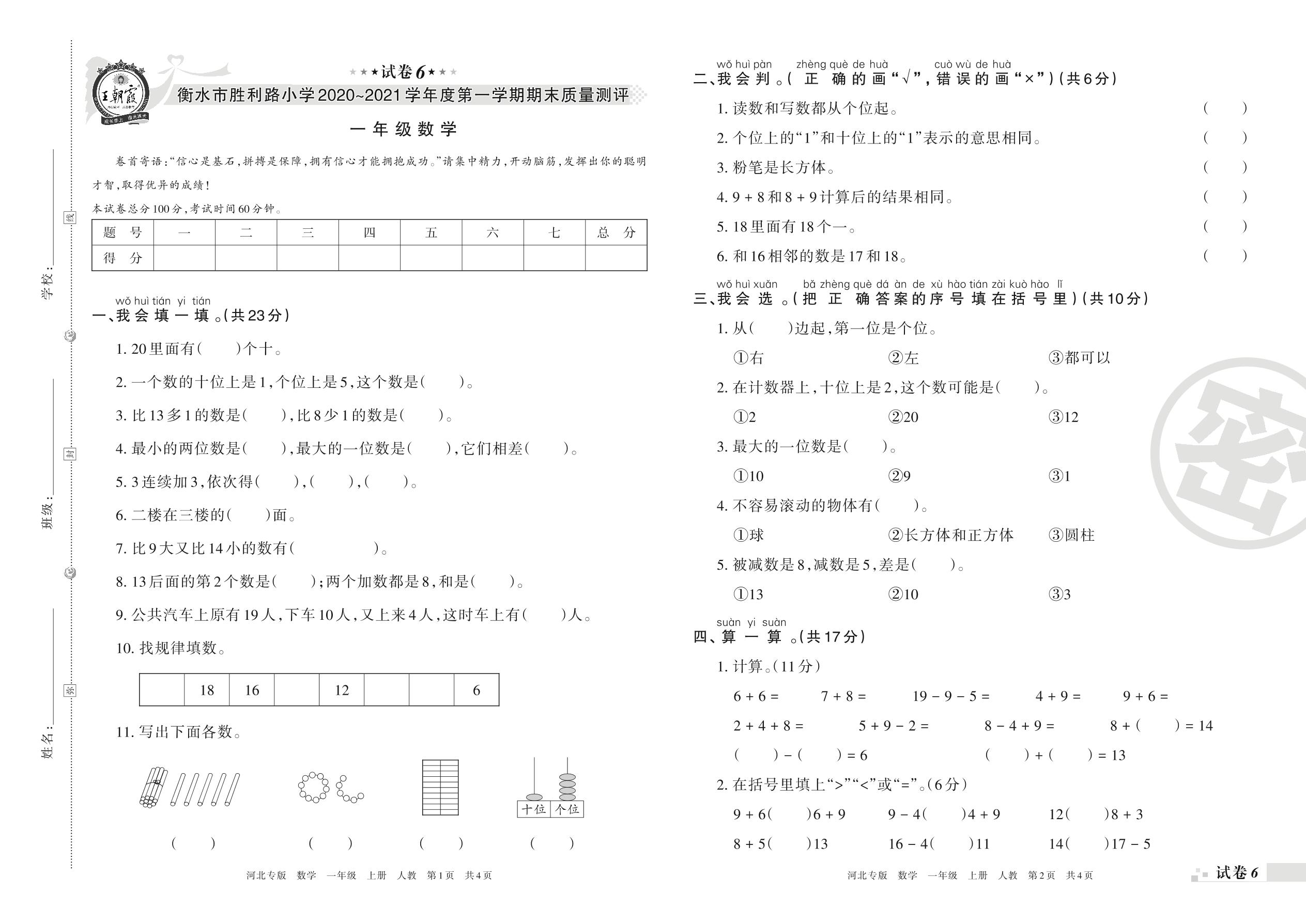 衡水市胜利路小学2020~2021学年度第一学期期末质量测评一年级数学(人教版)【6】