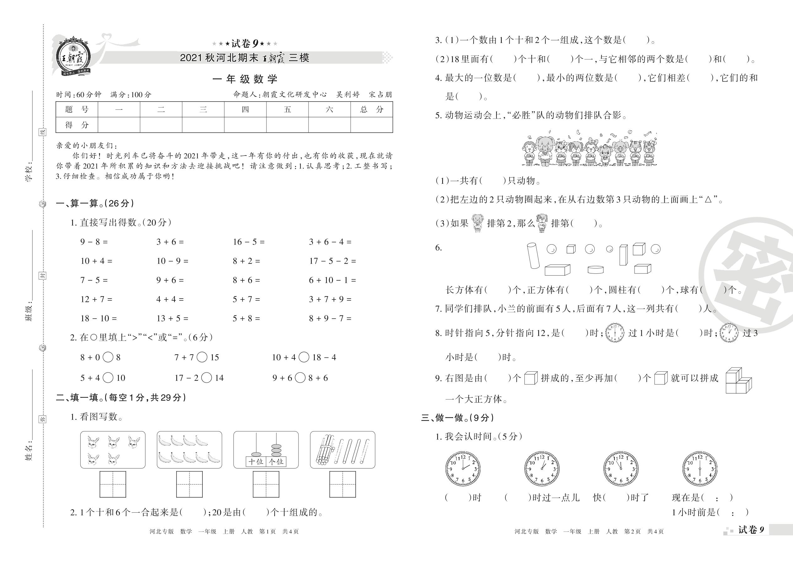 王朝霞期末模拟卷一年级上册数学(人教版)_R211224104559290【9】