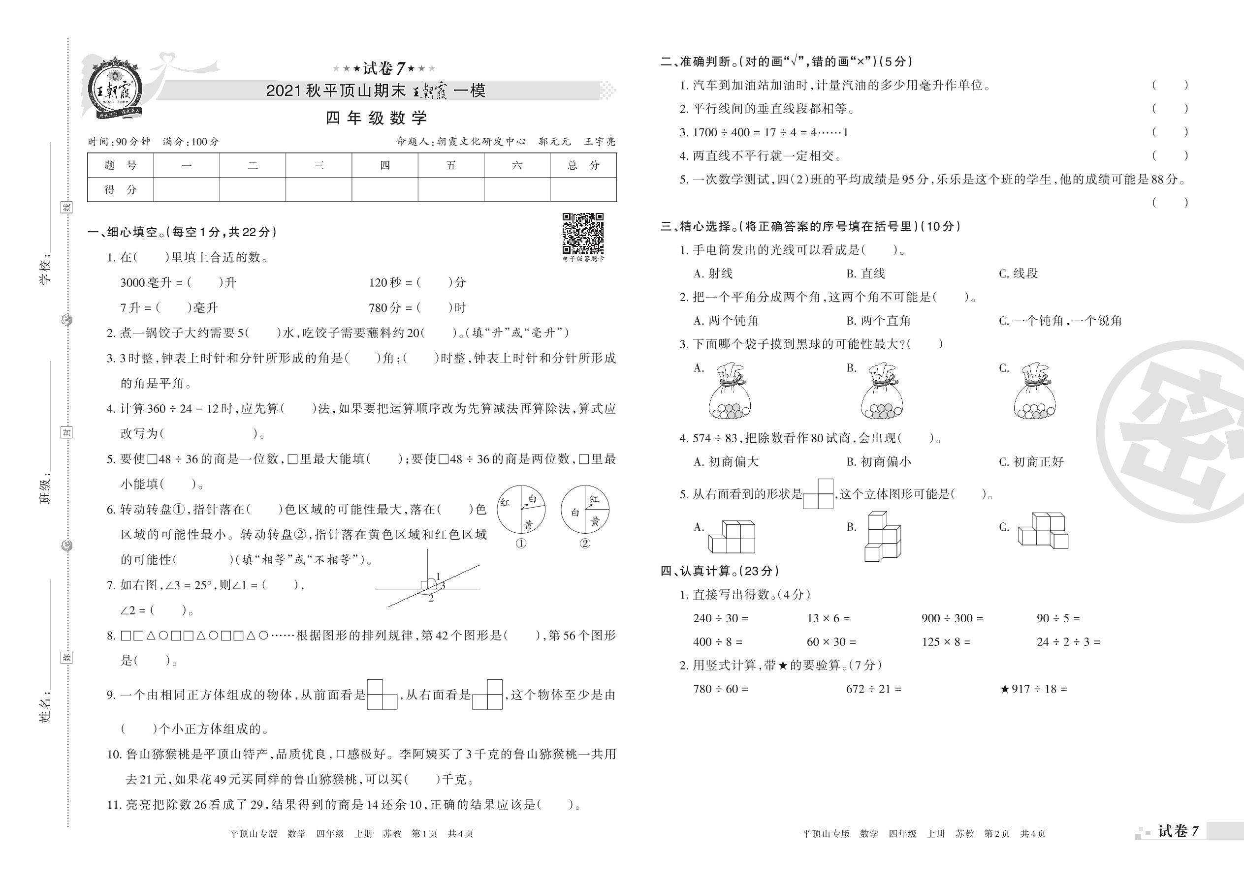 王朝霞期末模拟卷四年级上册数学(苏教版)_R211224104848432【7】