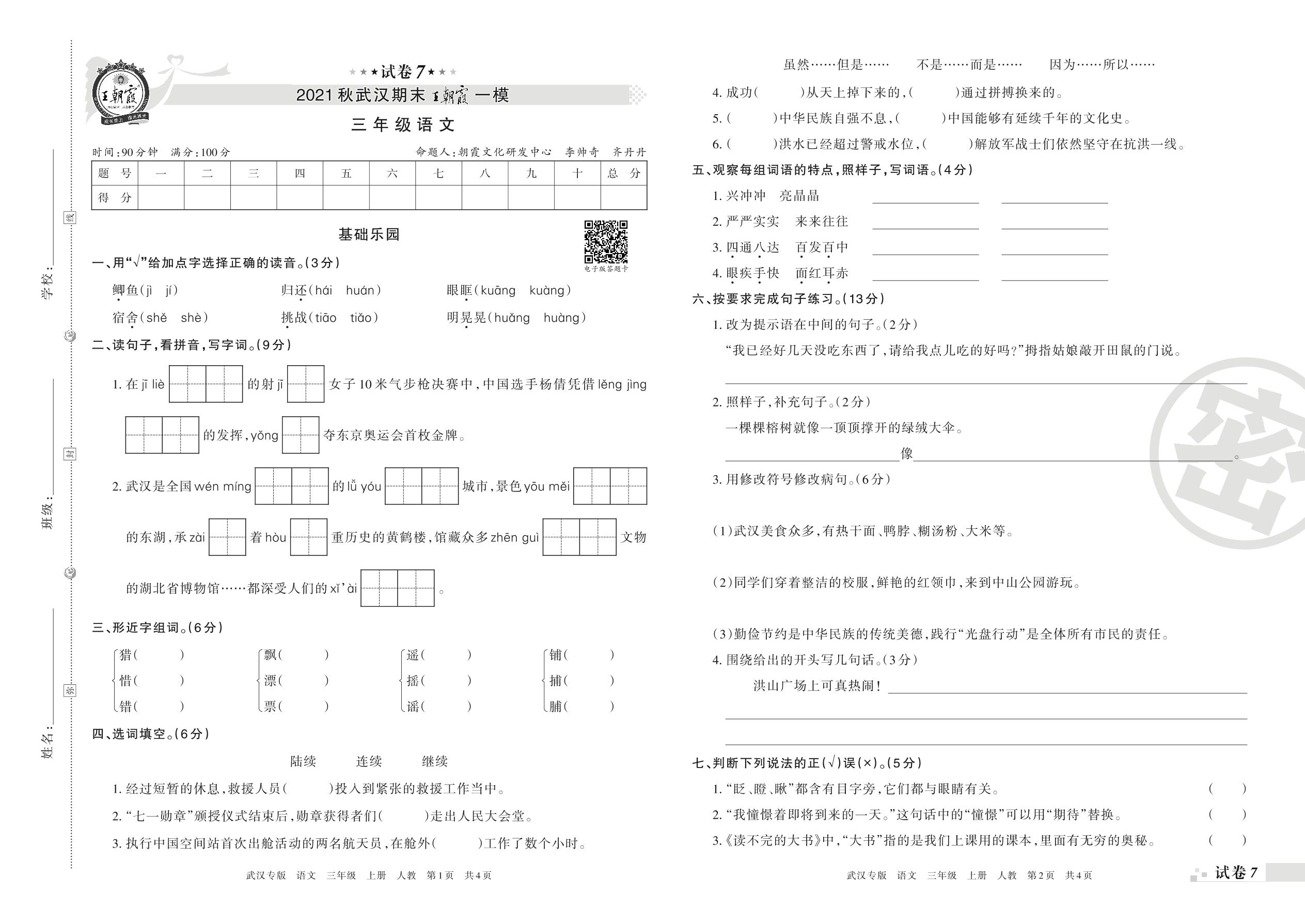 王朝霞期末模拟卷三年级上册语文(人教版)_R211224105339511【7】