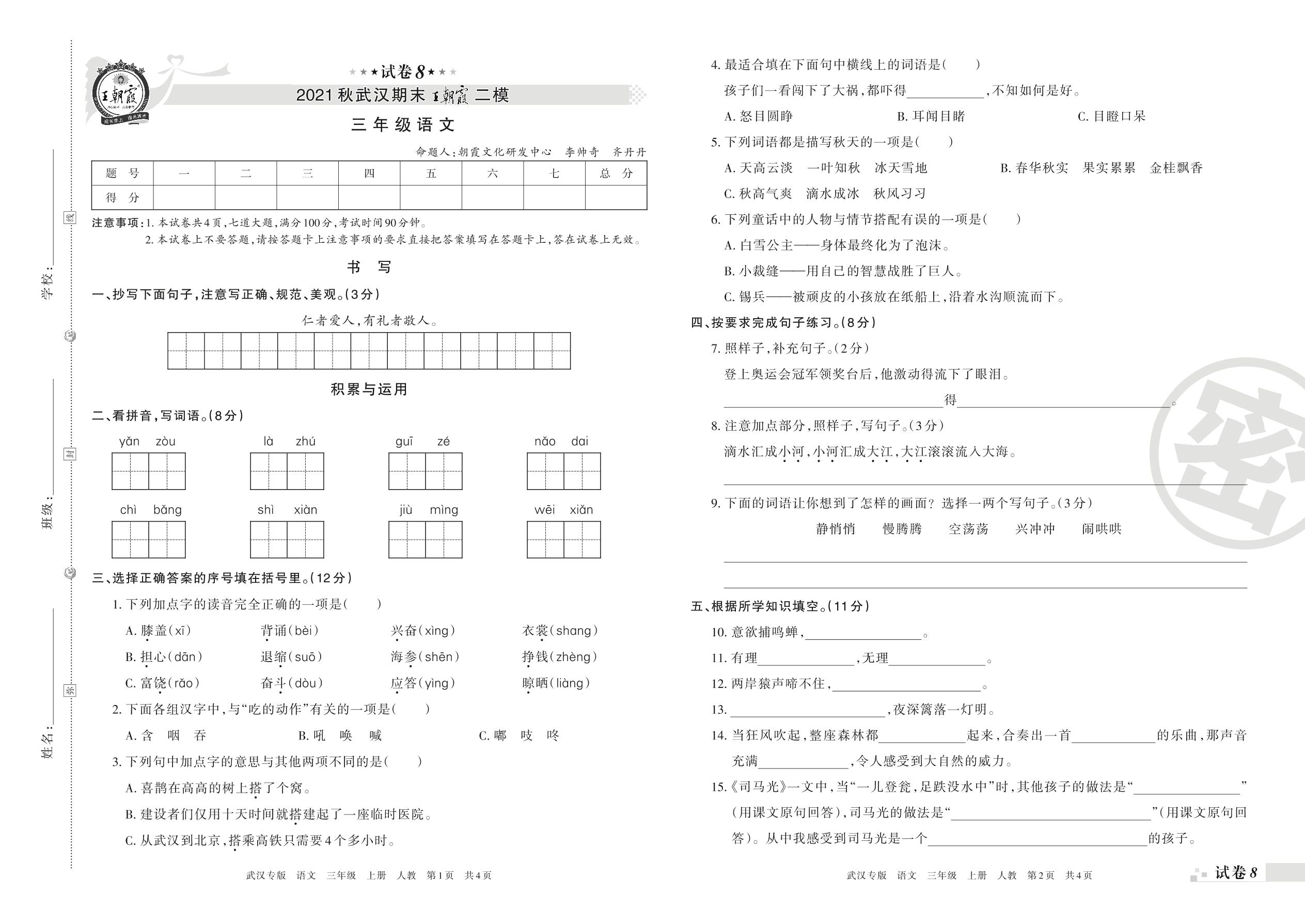 王朝霞期末模拟卷三年级上册语文(人教版)_R211224105339054【8】