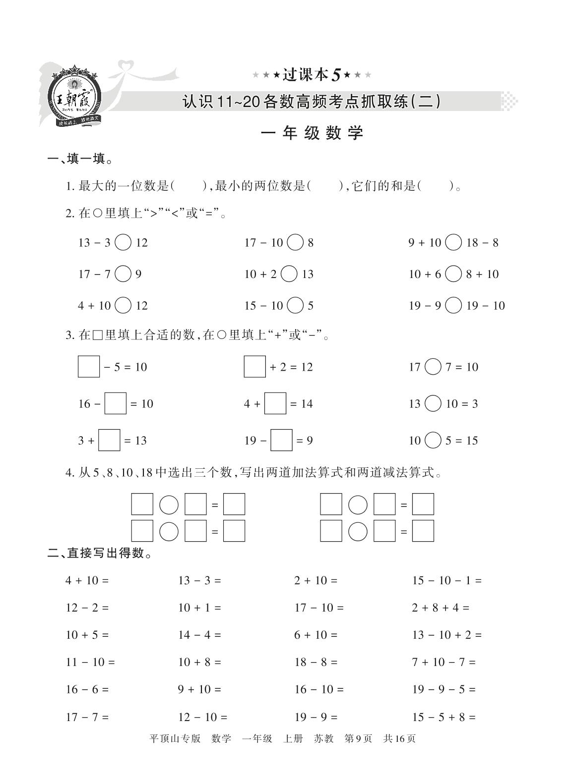 王朝霞期末过课本——认识11~20各数高频考点抓取练(二)一年级上册数学(苏教版)_R211224105643142【5】