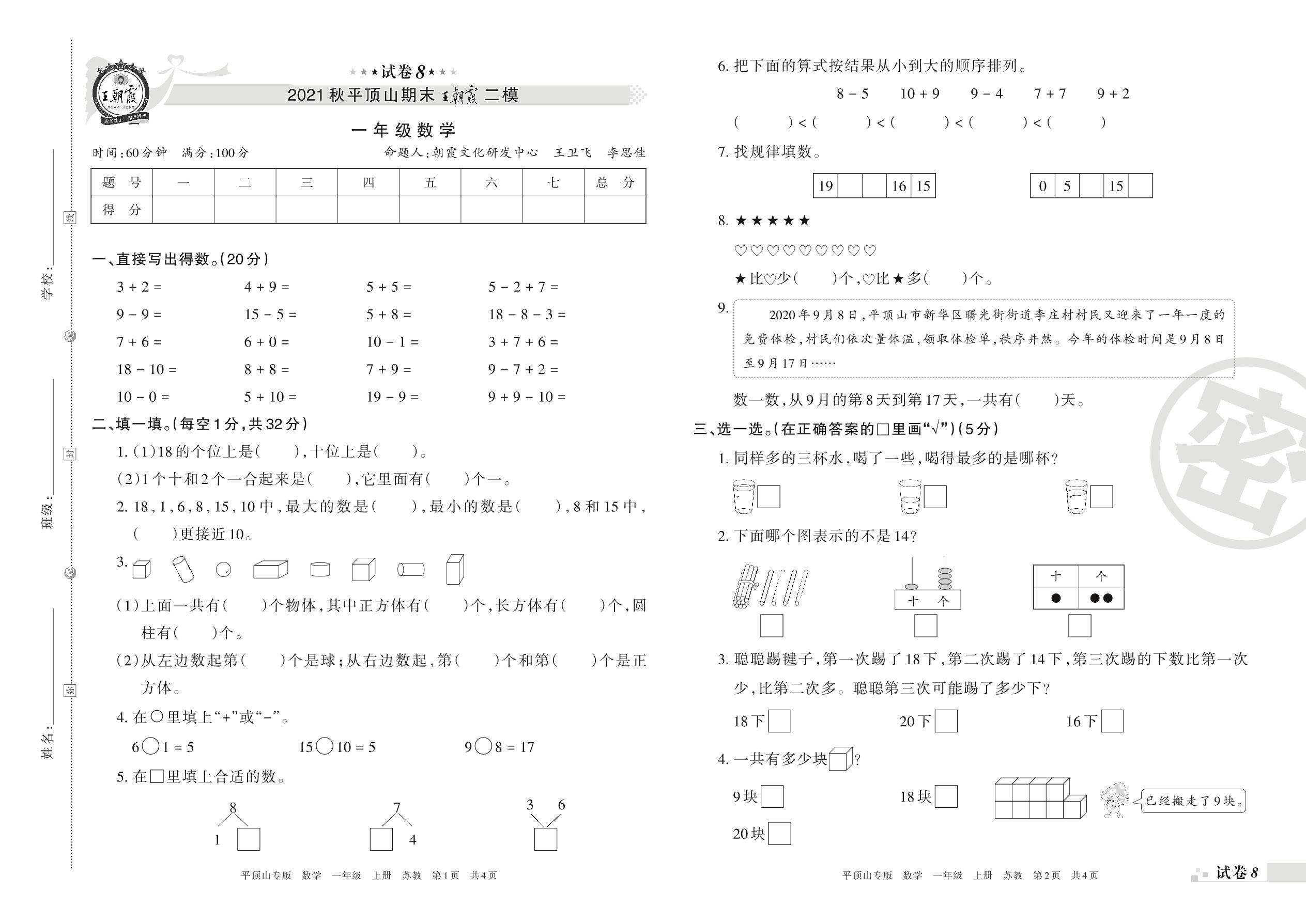 王朝霞期末模拟卷一年级上册数学(苏教版)_R211224105644367【8】