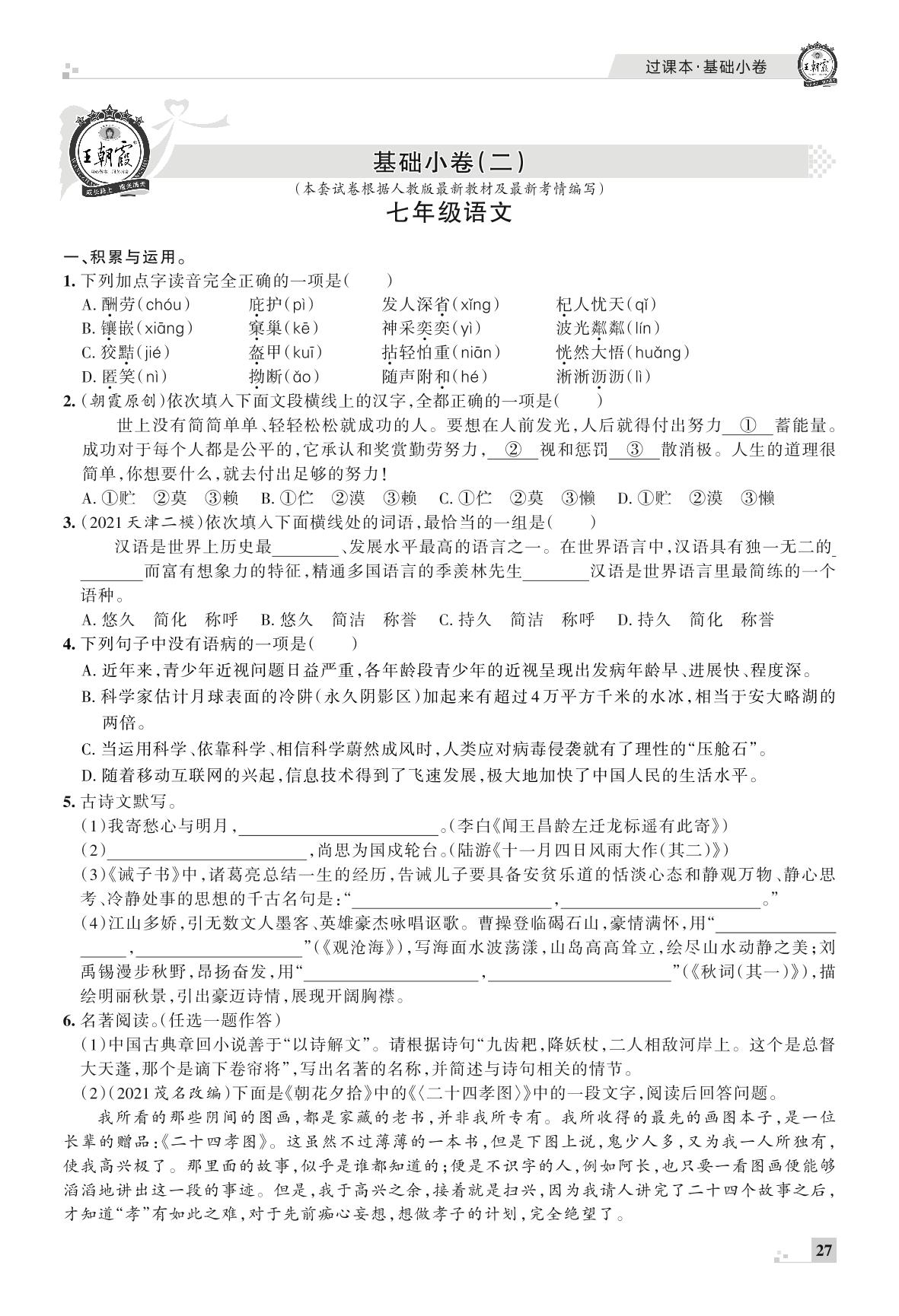 王朝霞期末过课本——基础小卷(二)七年级上册语文(人教版)_R211224105901457【8】
