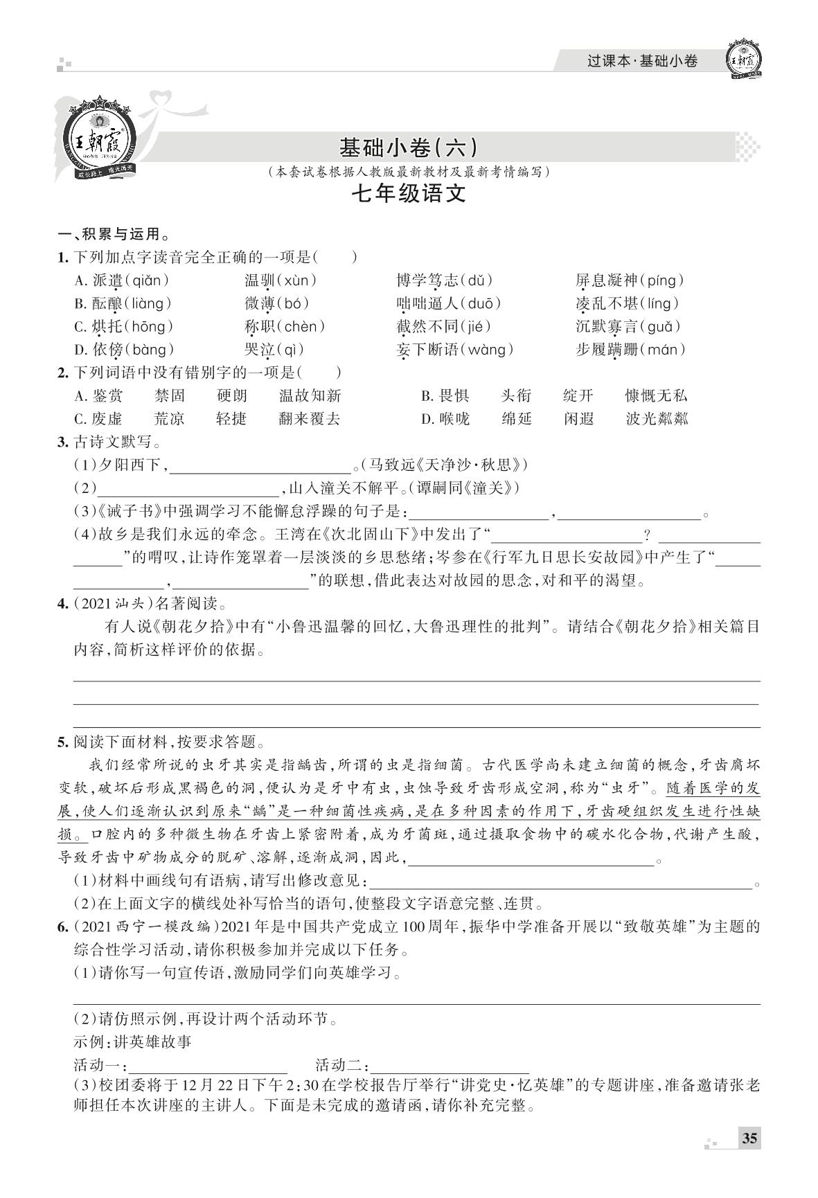王朝霞期末过课本——基础小卷(六)七年级上册语文(人教版)_R211224105902450【12】
