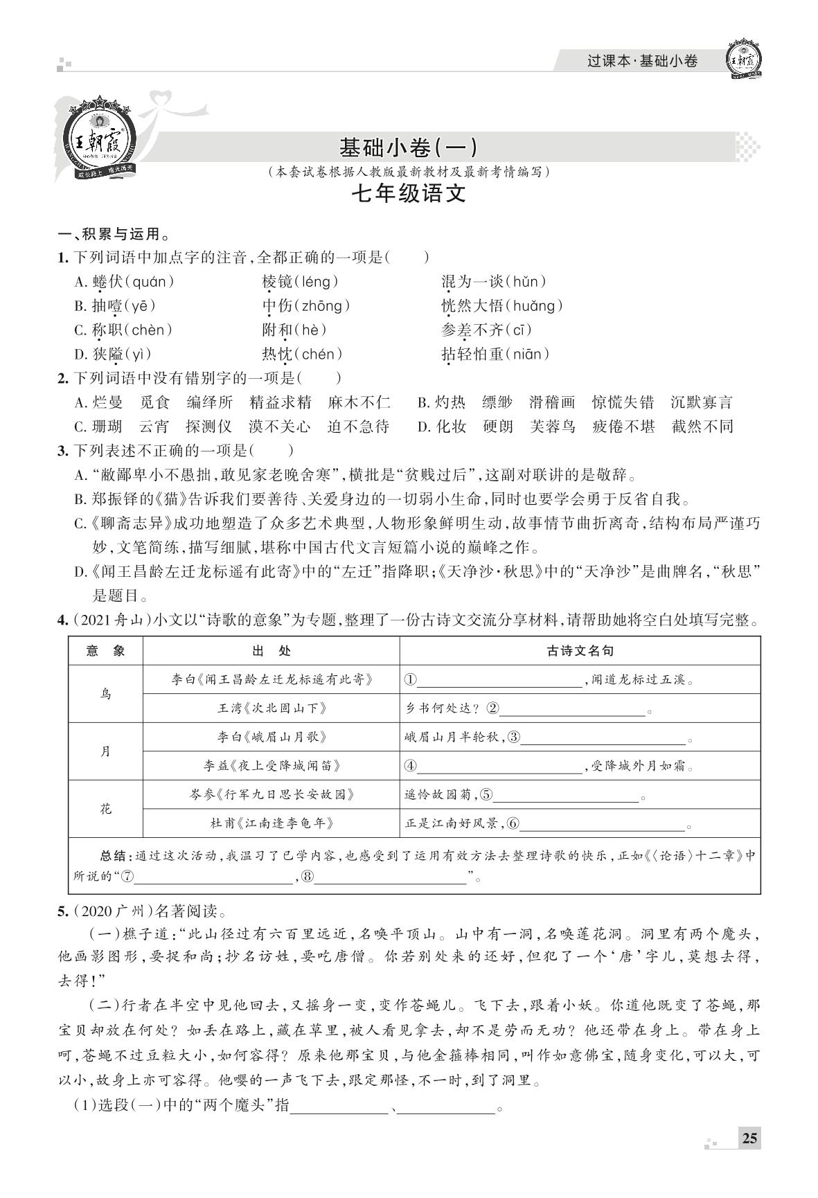 王朝霞期末过课本——基础小卷(一)七年级上册语文(人教版)_R211224105902255【7】