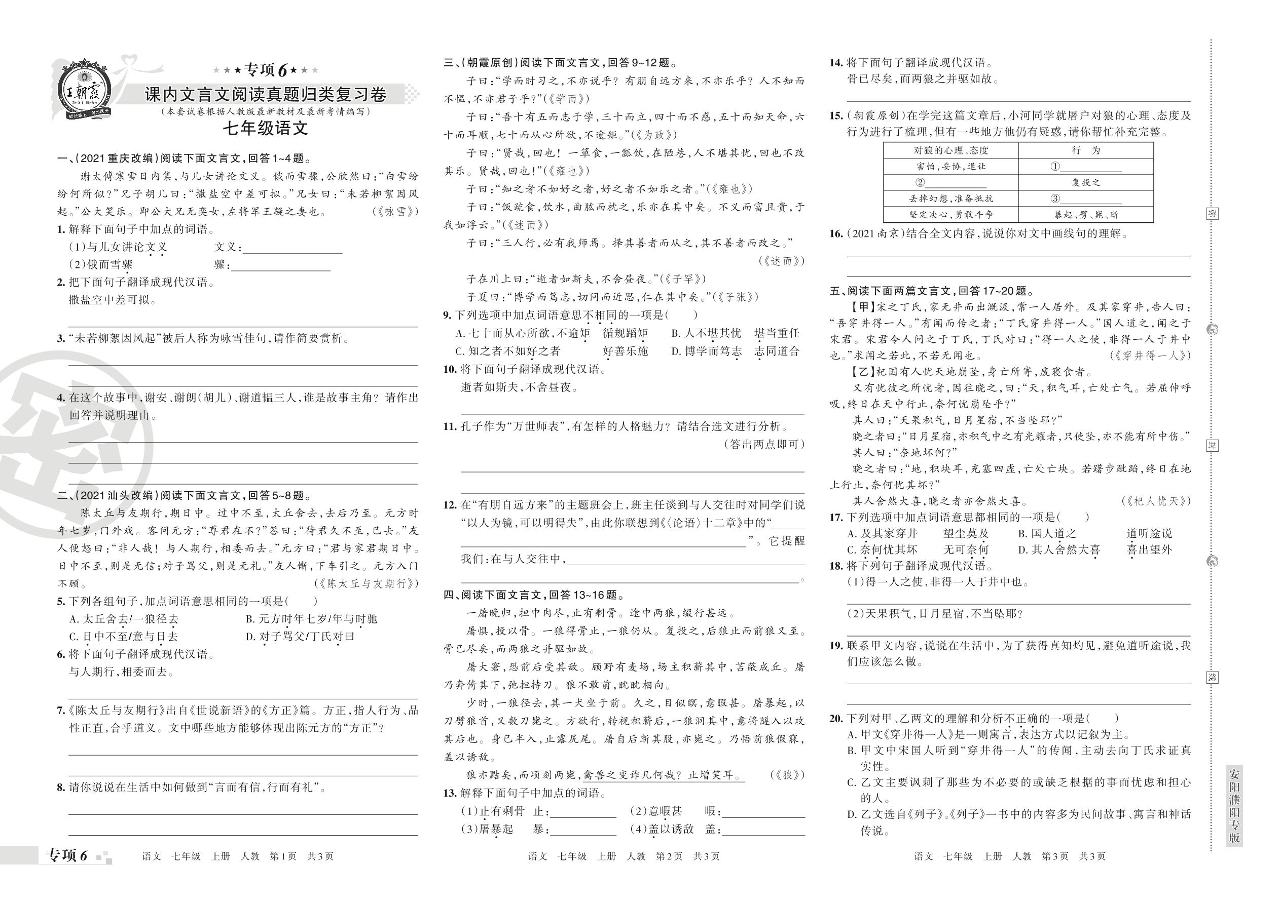 王朝霞期末专项卷——课内文言文阅读真题归类复习卷七年级上册语文(人教版)_R211224105902251【6】