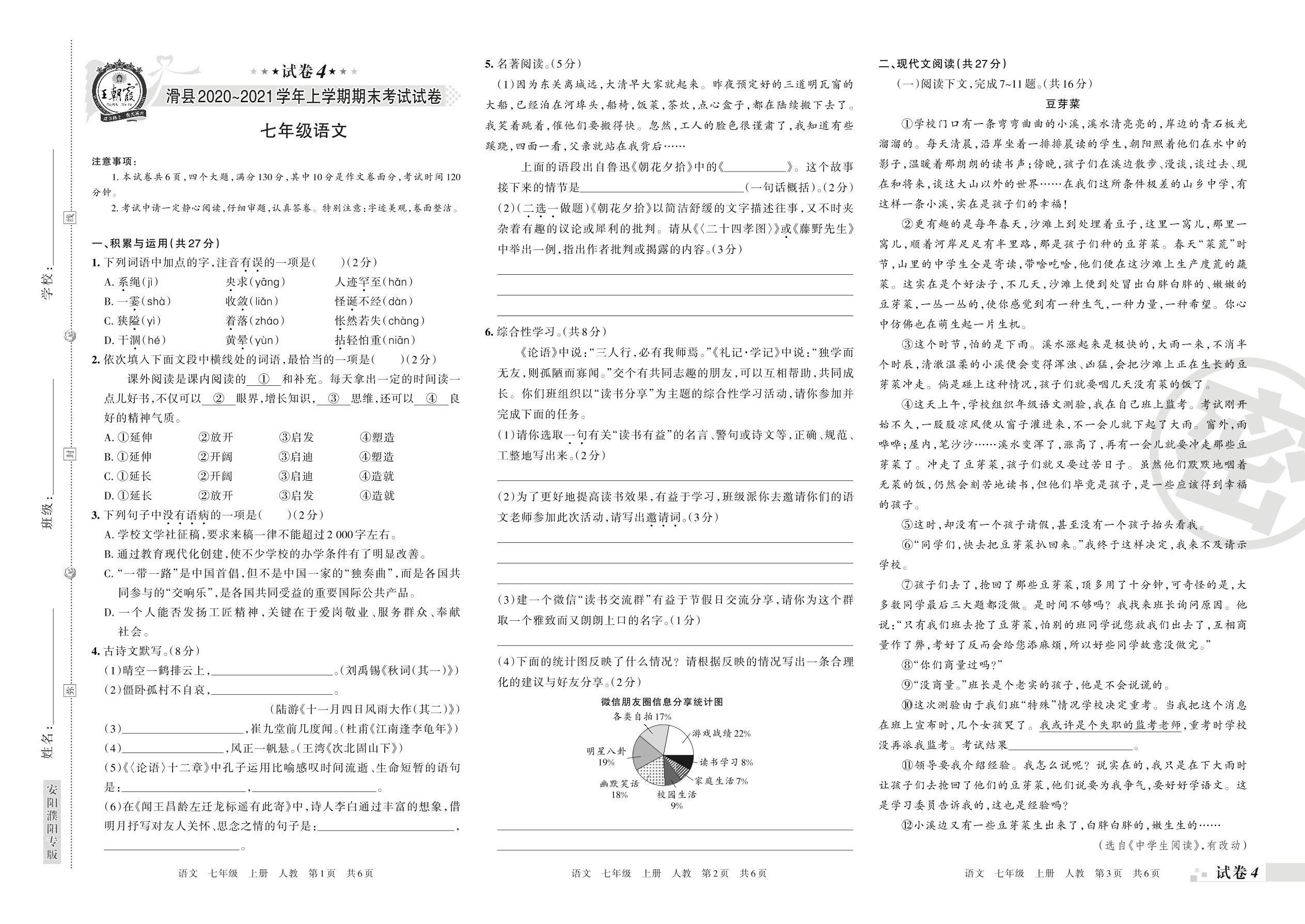 滑县2020~2021学年上学期期末考试试卷七年级语文(人教版)【4】