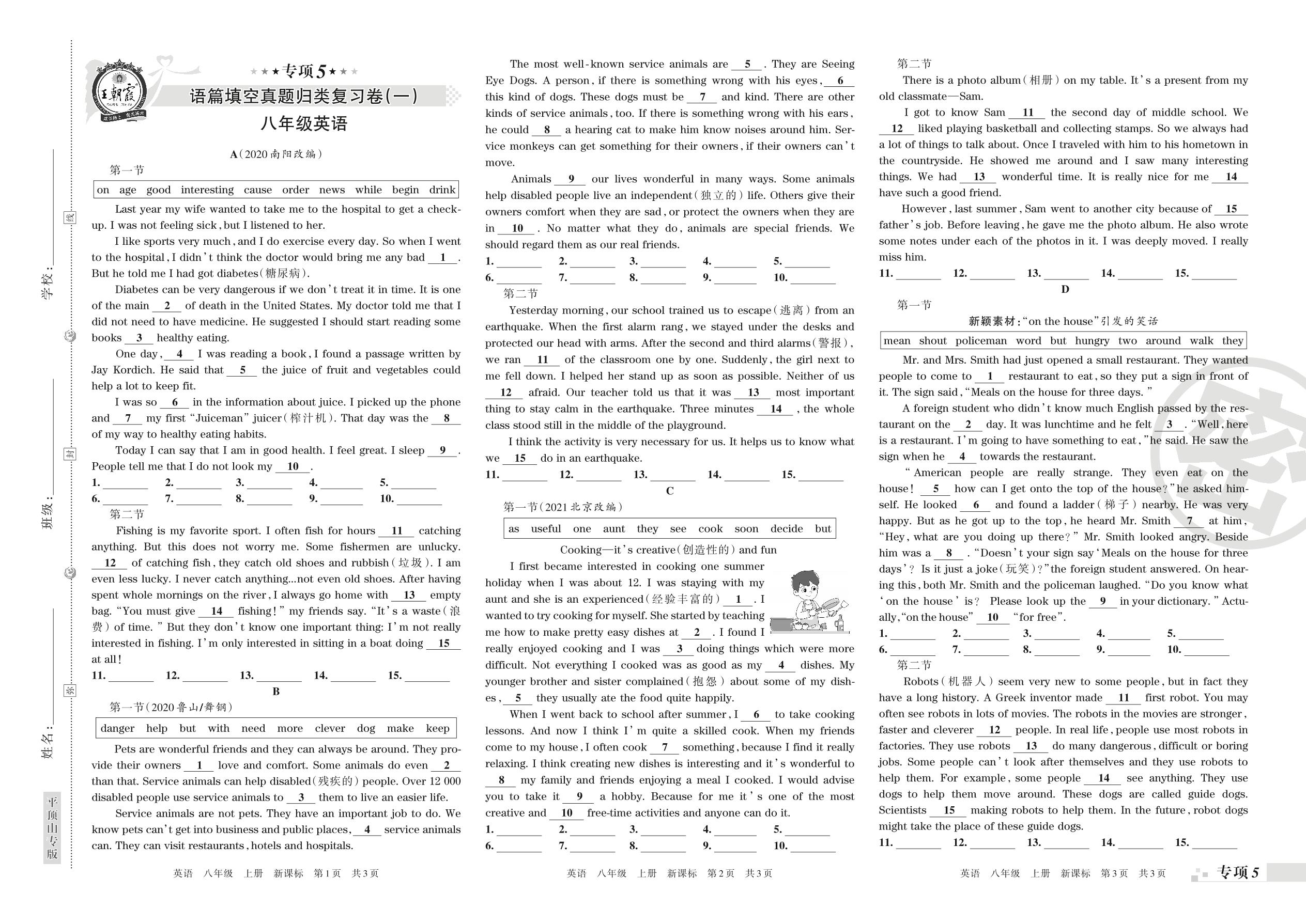 王朝霞期末专项卷——语篇填空真题归类复习卷(一)八年级上册英语(新课标)【5】