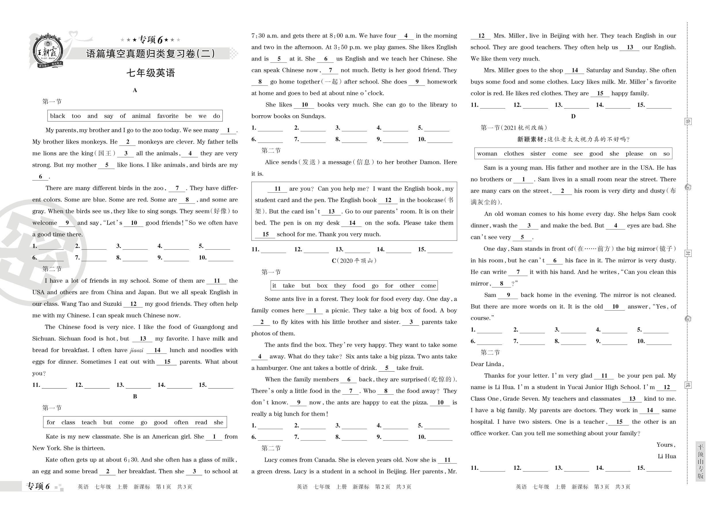 王朝霞期末专项卷——语篇填空真题归类复习卷(二)七年级上册英语(新课标)【6】