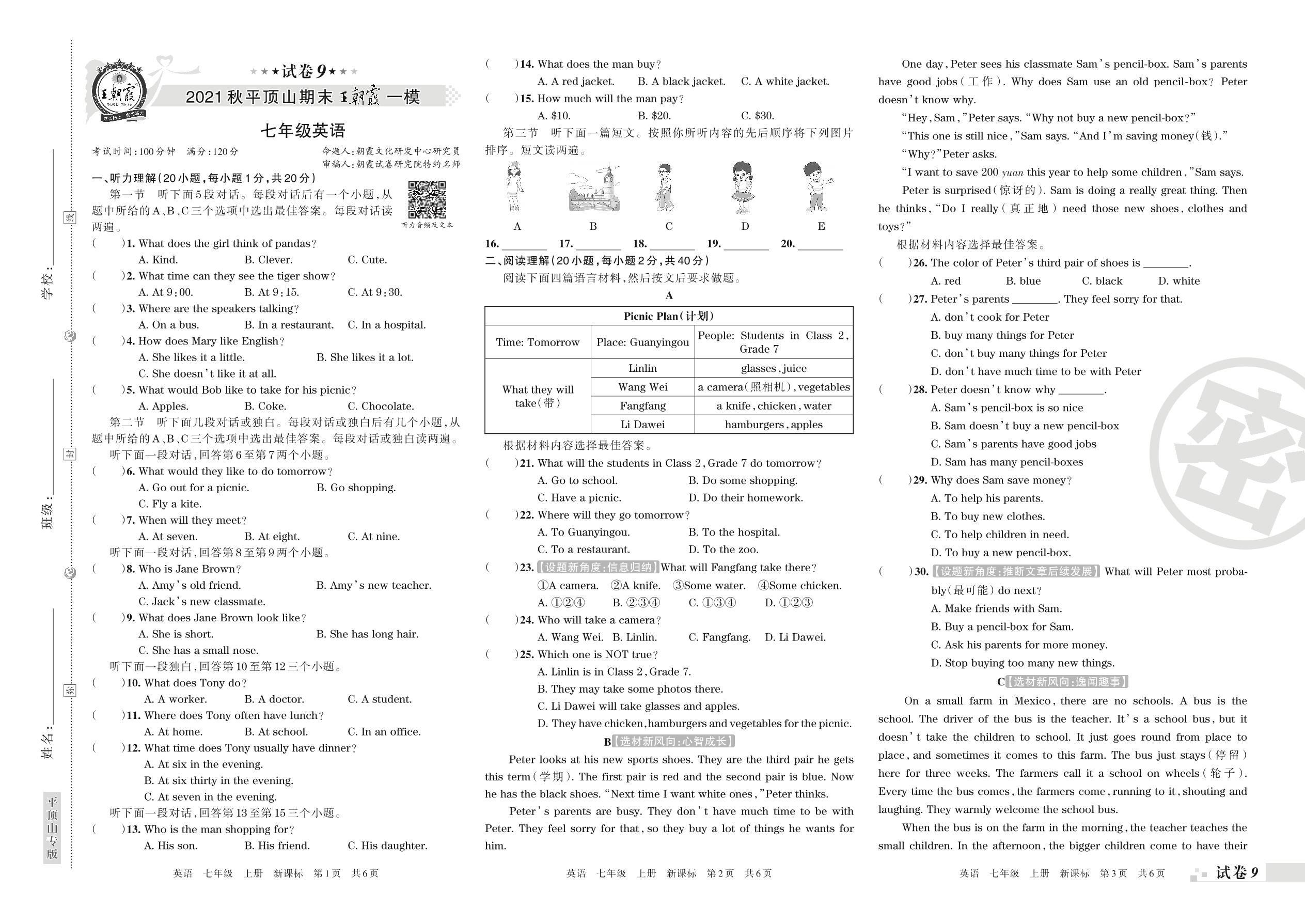 王朝霞期末模拟卷七年级上册英语(新课标)【9】