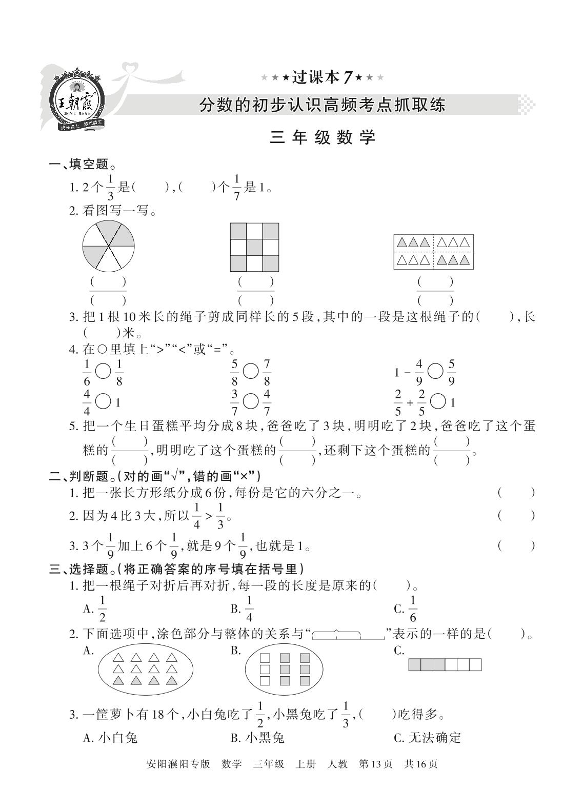王朝霞期末过课本——分数的初步认识高频考点抓取练三年级上册数学(人教版)_R211224110806869【7】