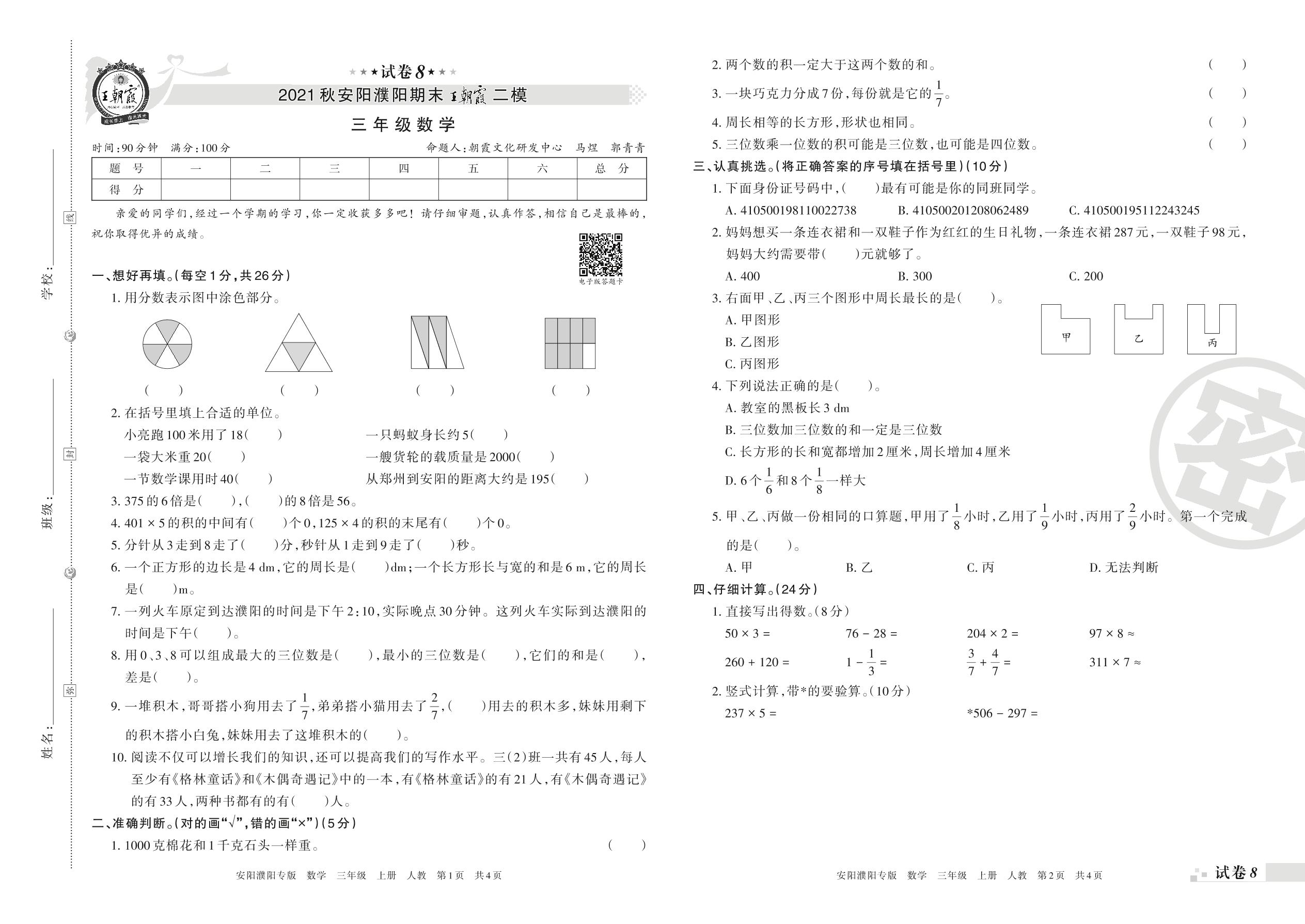 王朝霞期末模拟卷三年级上册数学(人教版)_R211224110807772【8】