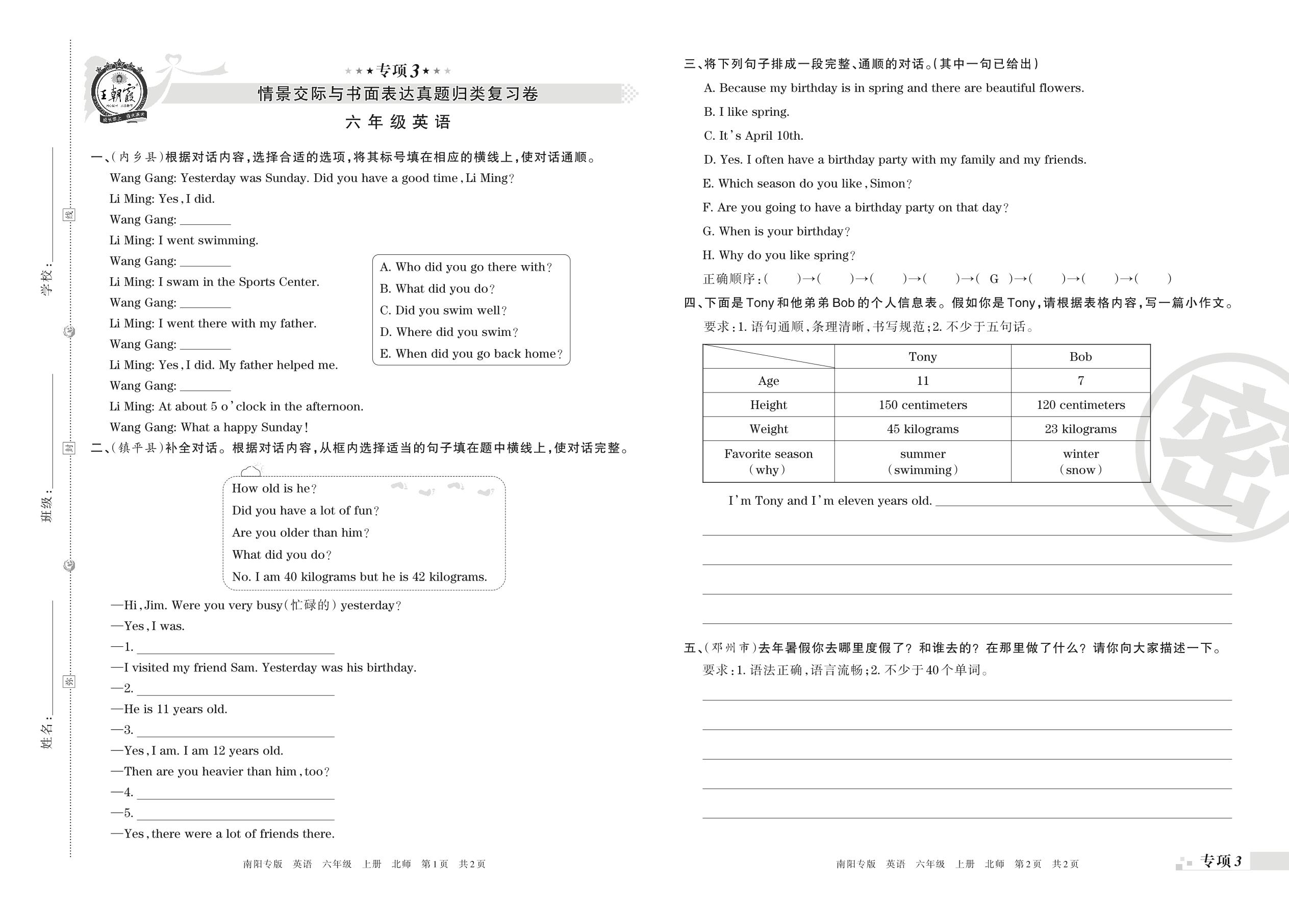王朝霞期末专项卷——情景交际与书面表达真题归类复习卷六年级上册英语(北师版)【3】