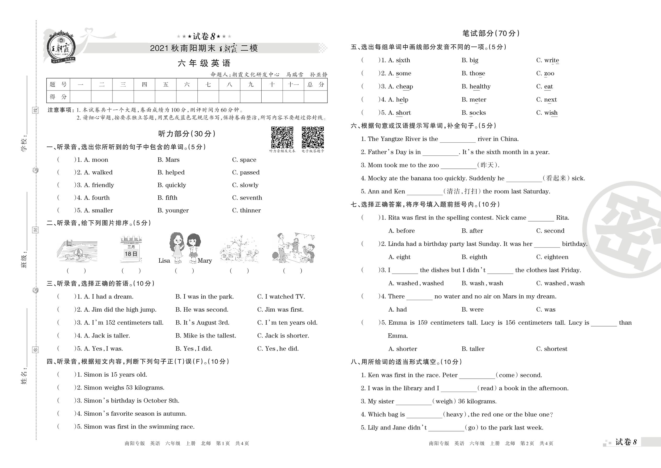 王朝霞期末模拟卷六年级上册英语(北师版)【8】
