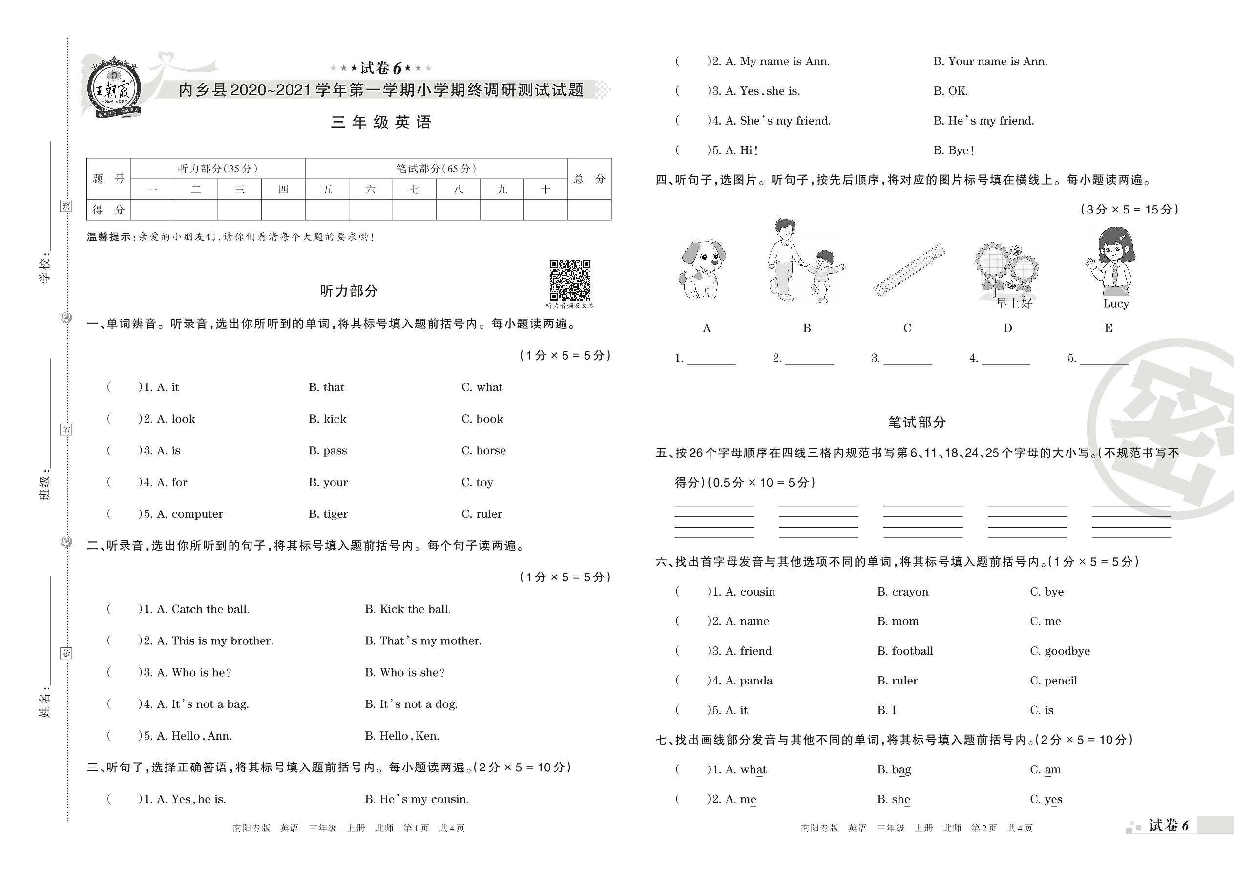 内乡县2020~2021学年第一学期小学期终调研测试试题三年级英语(北师版)【6】