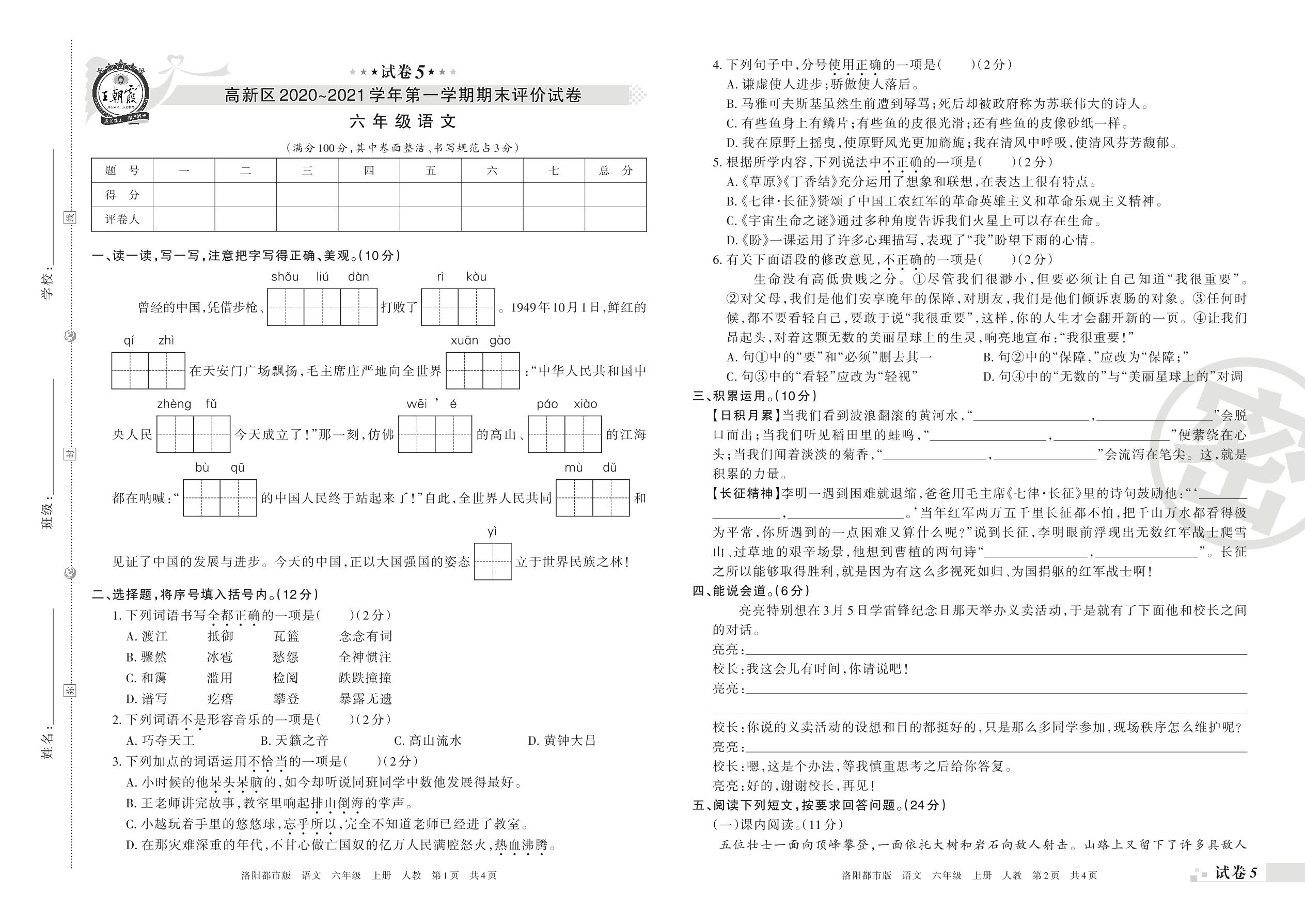 高新区2020~2021学年第一学期期末评价试卷六年级语文(人教版)【5】